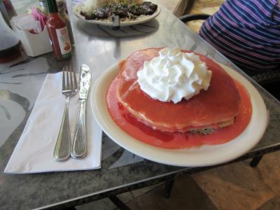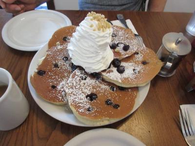 このお店は混んでいて待ち時間が長い印象があるが、正午前に行くと待ち時間なく入れる。朝食と昼食の隙間の時間は比較的空いている。パンケーキのブルーベリー入りを注文したが、オーソドックスなイチゴの方がおいしかった。午後2時からでないと注文できないとてもおいしそうなパンケーキがあった。