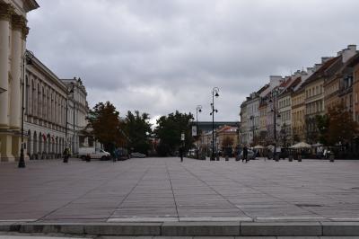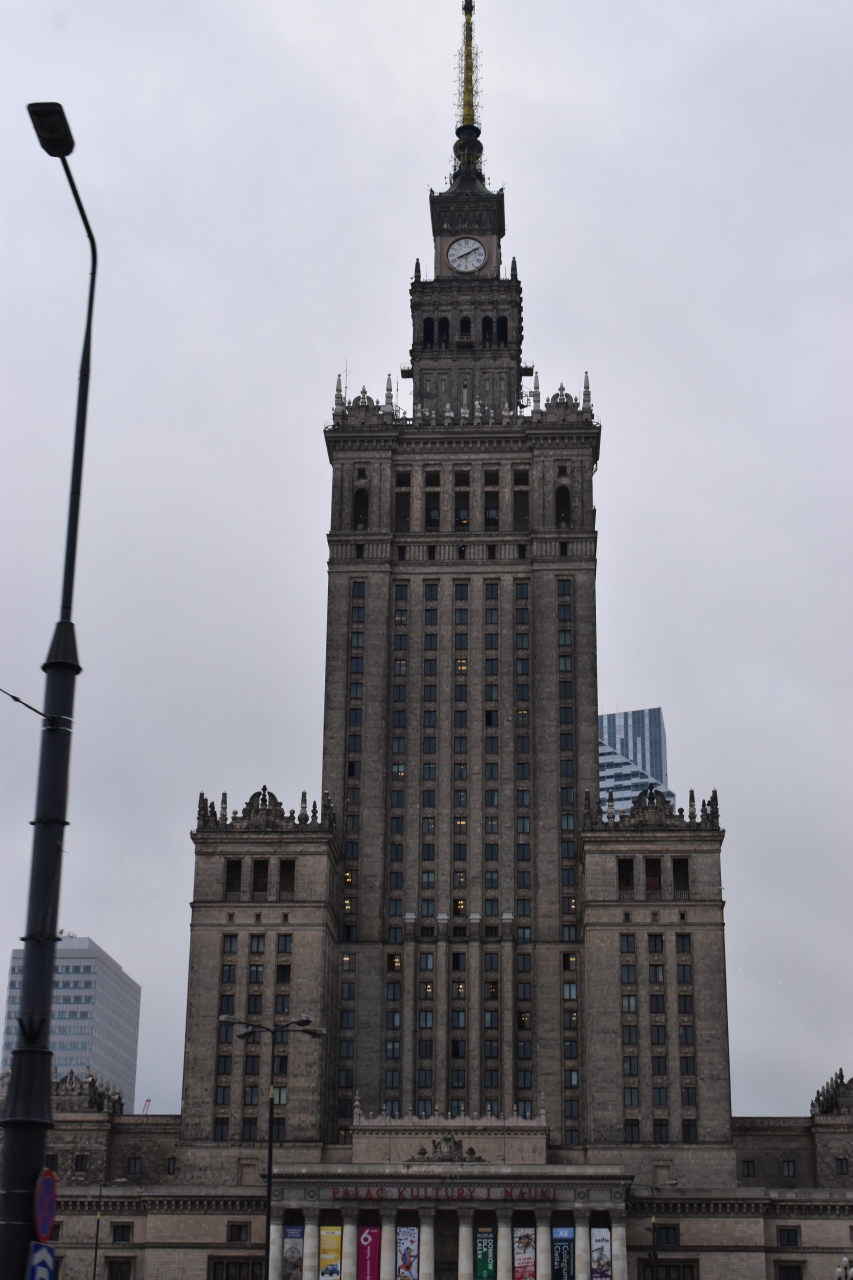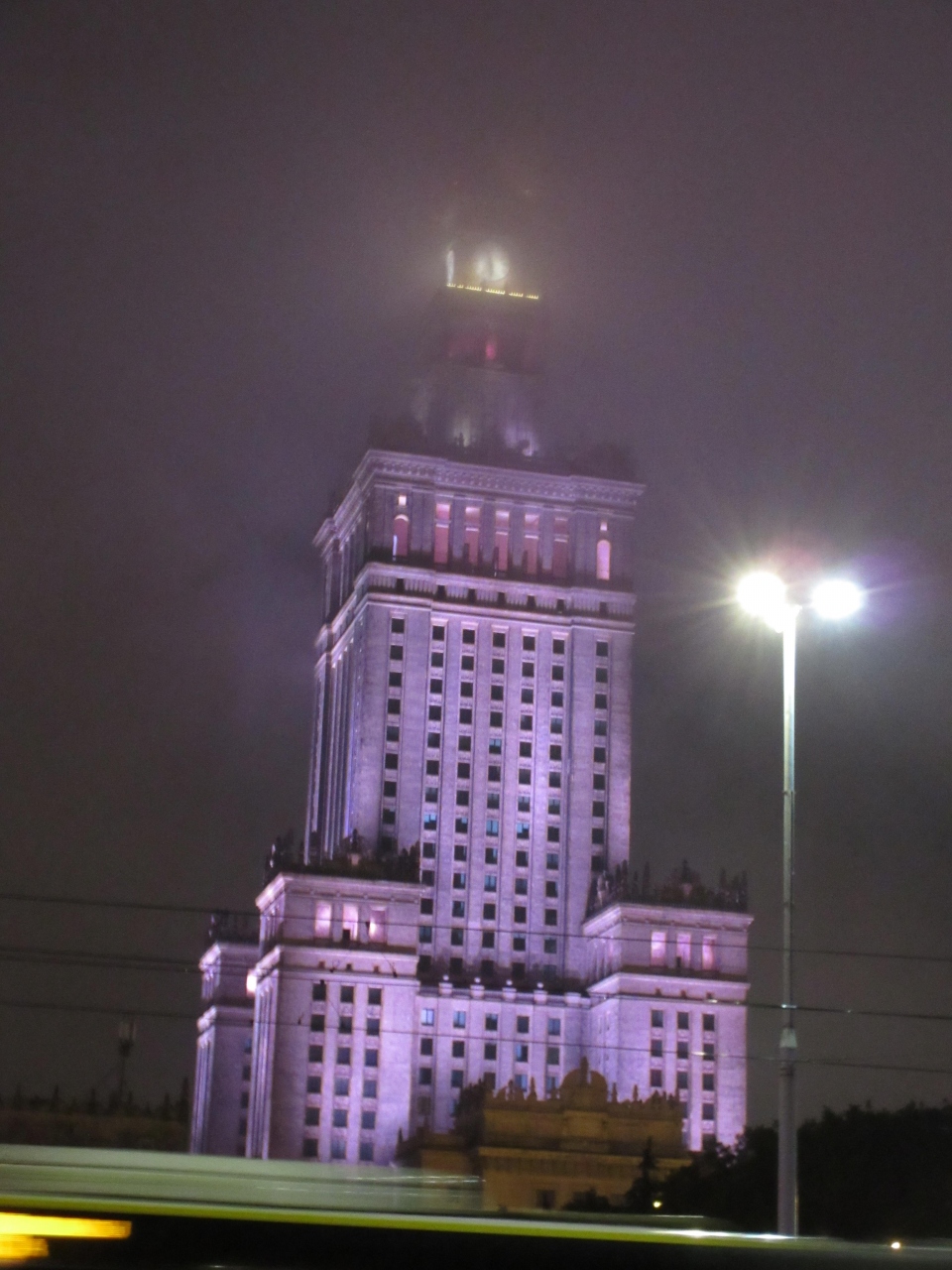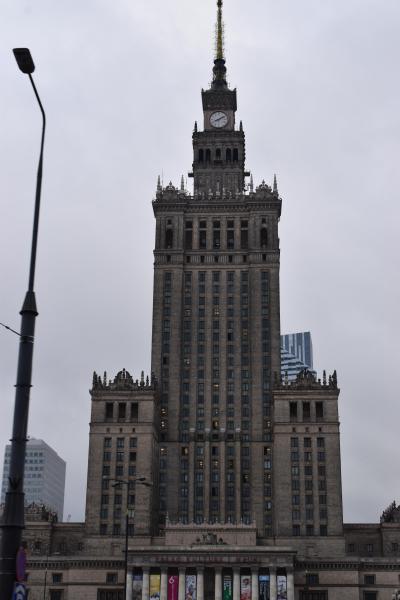 ワルシャワ中央駅に夜に着き、外へ出ると突然、目の前に青くライトアップされた高層の文化科学宮殿が見えて驚いた。ソ連時代を連想させる建物である。上の階には霧がかかり、青白いライトが幻想的であった。周囲の建物は低く調和を欠くようでスターリンのお土産という印象を免れない。
