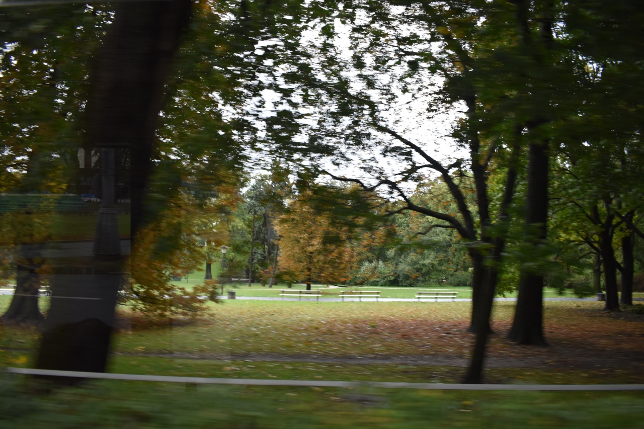 トラムの路線がすぐ近くを通っている。見渡しても人影が見えないほど大きな公園。木々が多く、地面も緑で全体が緑色でリフレッシュできる。ワルシャワは緑の木々が多いという印象を受けたが、サスキ公園も一役かっている。