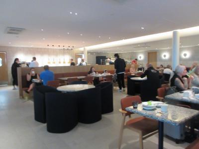 空港にあるごく普通のラウンジで、特に特徴はない。あまり食べ物や飲み物の種類は多いとは言えない。ゆったりと座れ、後ろにもたれかかることのできるソファーがあるとよいと思う。人手が不足しているのか使われた食器の片づけがされていないテーブルが多くあった。