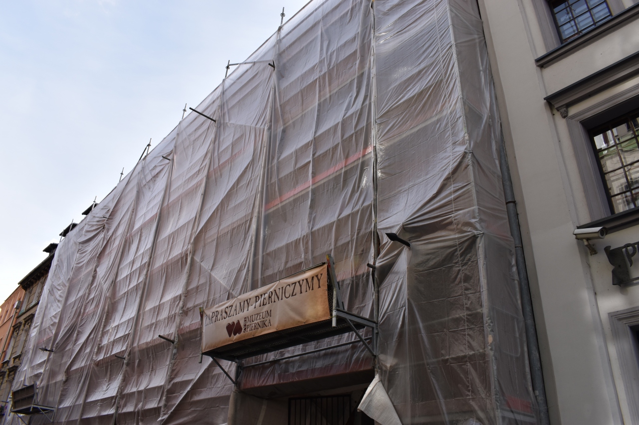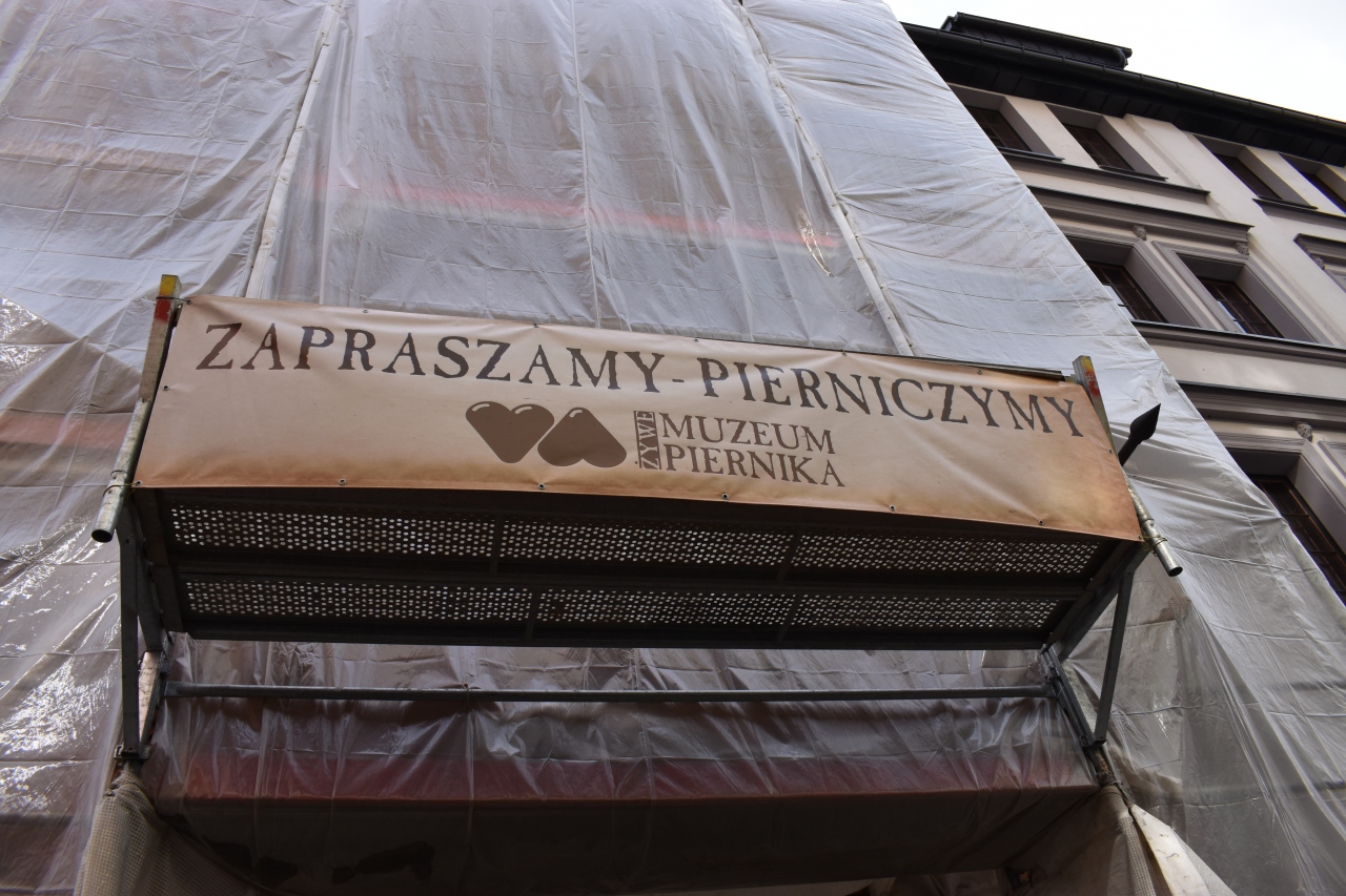 博物館は工事中で建物全体が幕で覆われ、入り口に柵がしてあり木戸は閉じられていました。ガイドブックには無休と記載されていましたので訪れた日曜日も入れると思いましたが残念でした。ピエルニクはラパツキエゴ広場に向かう途中にコぺルニク・トルンのお店があり購入することができます。