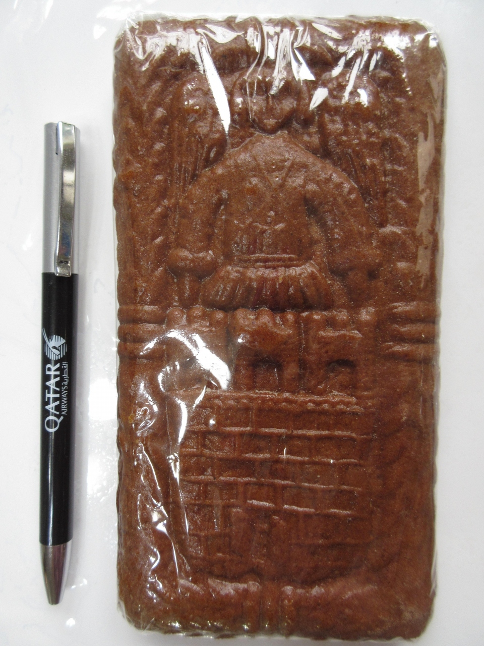クッキーなので割れずに持ち帰ることが難しいと思い箱入りをお土産に買ったが、かなり堅く、箱に入れなかったものも割れずに日本まで持ち帰ることができた。いろいろなサイズと形があった。旅行案内書に載っていた写真と比べてかなり色が濃く、褐色である。