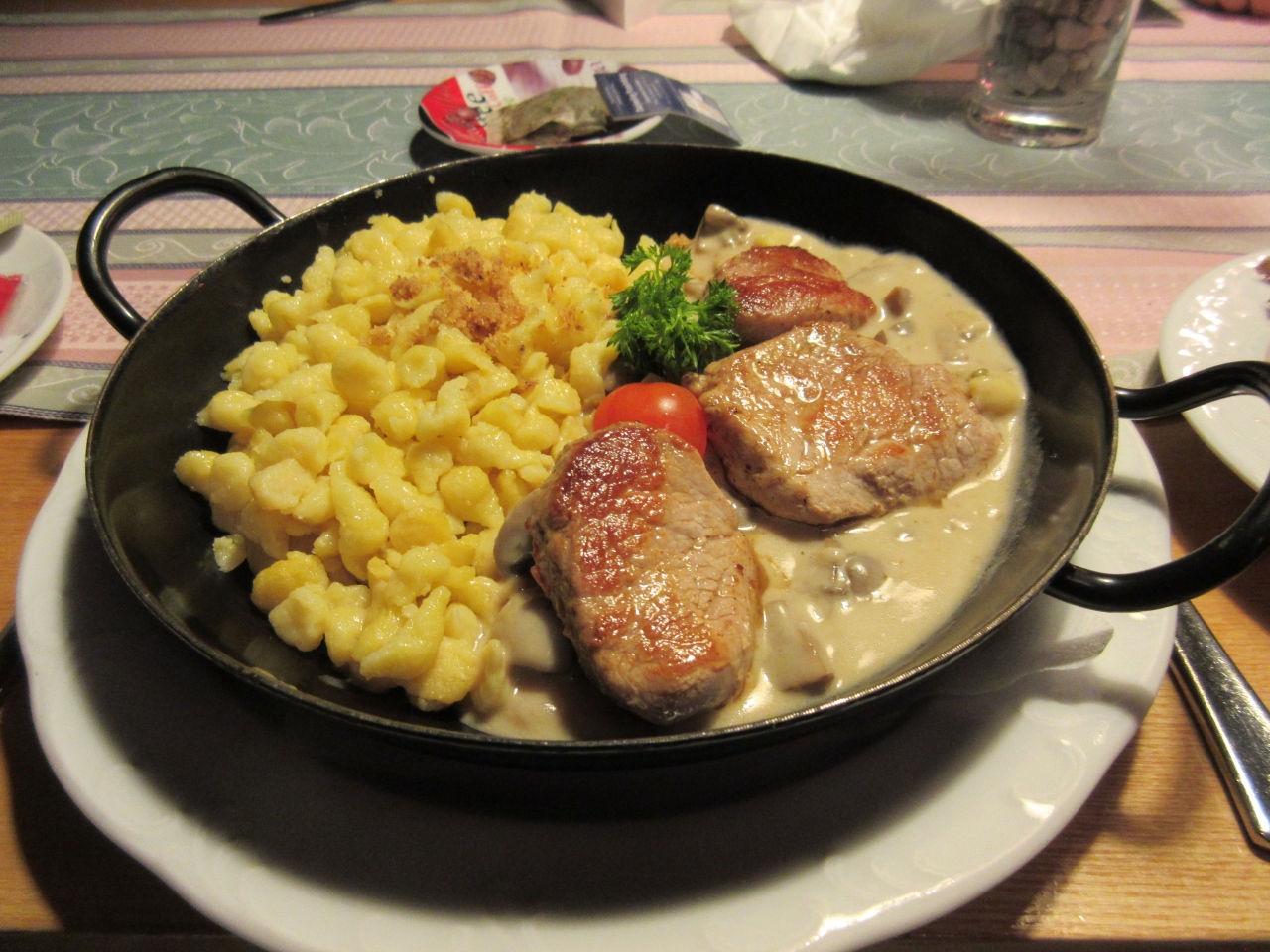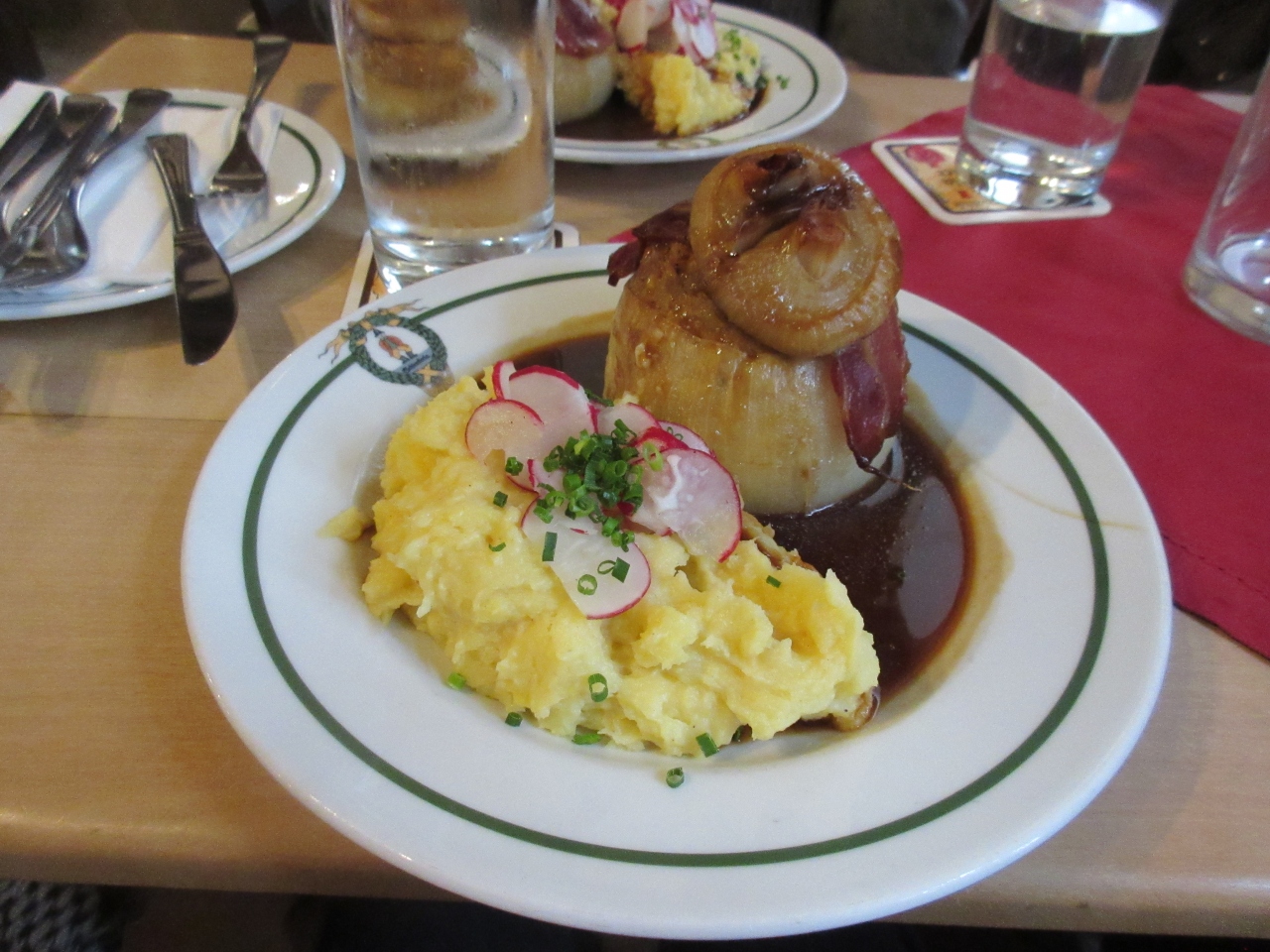 レストランというよりもビールを飲みたくて来ているお客さんが多いように見えた。黒ビールのラオホビーアが目当てのようで、それだけを注文して味わって飲んでいた。店内は広いが注文を取りにすぐに来てくれたが、会計には時間がかかる。玉ねぎの肉詰めは・・・本当にひき肉詰め。
