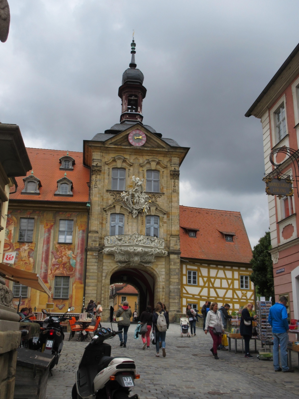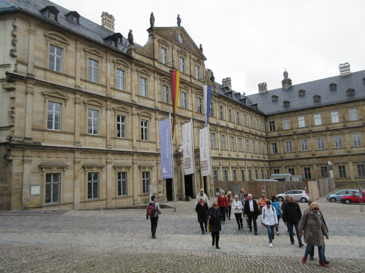 バンベルク中央駅から歩いて行くには少し距離がある。タクシーを利用した。空襲を受けなかったため街並みはそのまま残っている。石畳であるので歩くのには底が厚い靴をめしたい。旧市庁舎辺りは人が多く混んでいる。