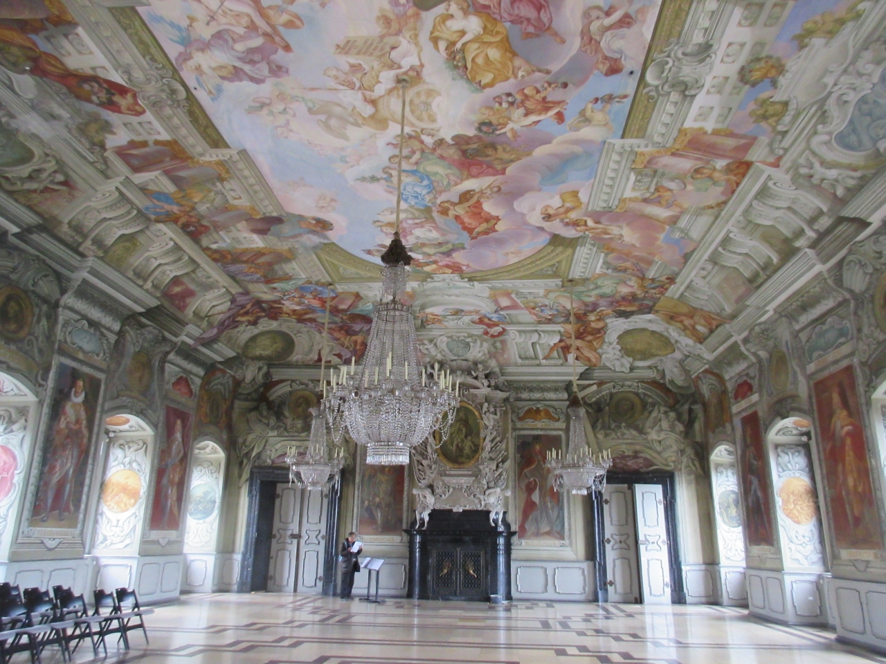 レジデンツの中にあるが建物の中からは行くことが出来ない。外へ出て別の入り口から入ることが出来る。中は豪華絢爛で白、赤、紫、灰色などの大理石がふんだんに使われている。金細工も見事である。空襲を幸運に受けずレジデンツに残った。