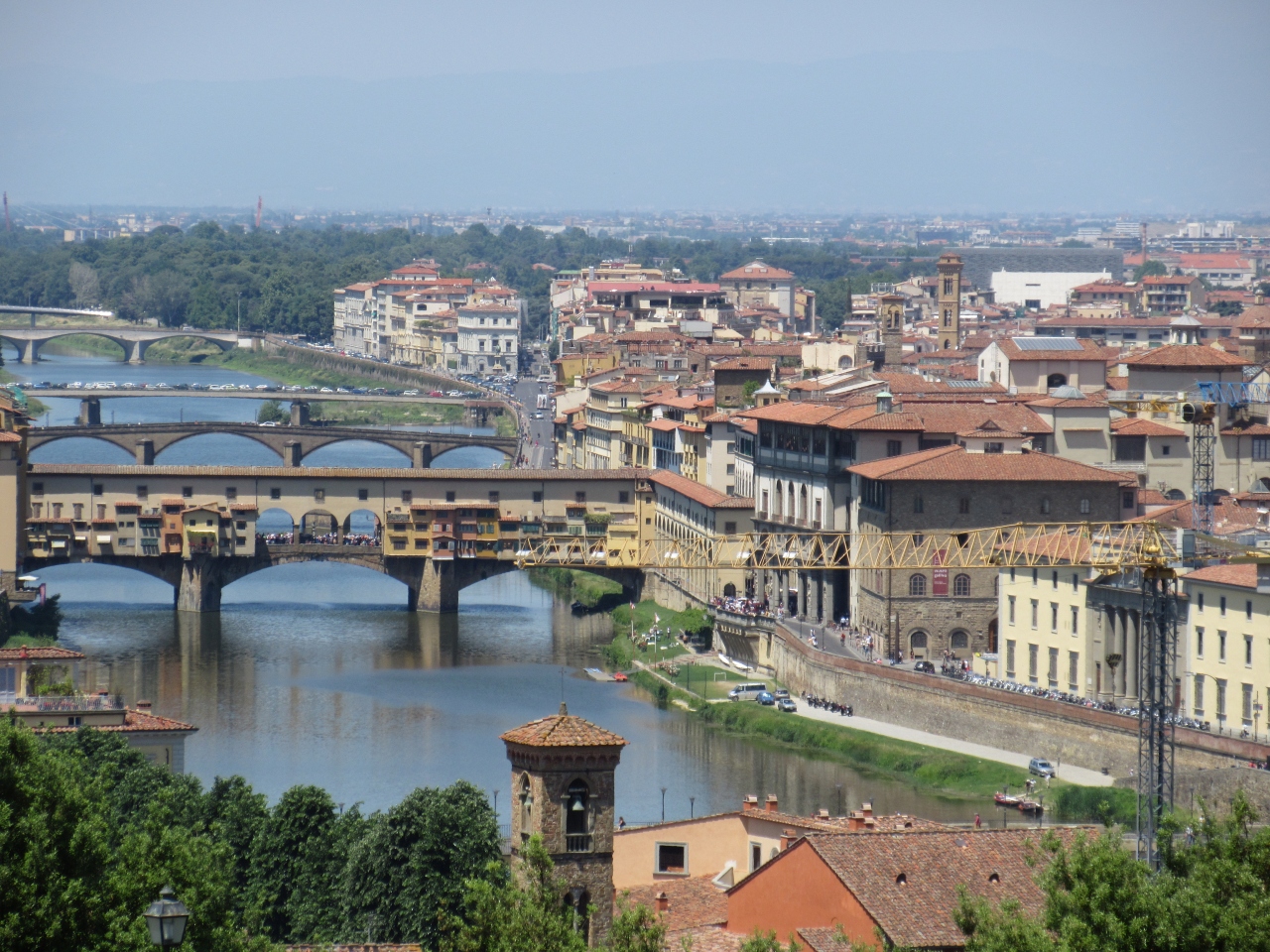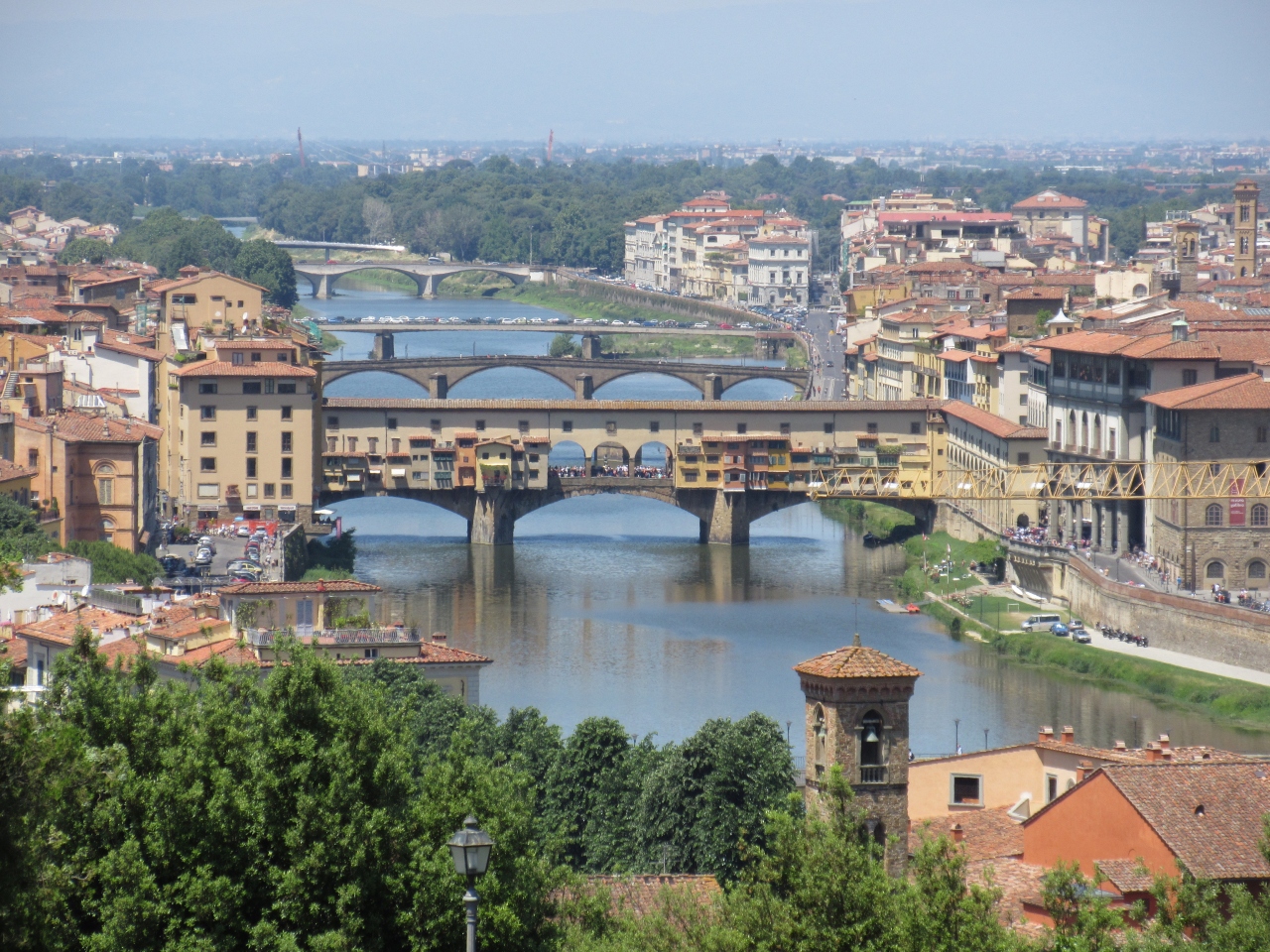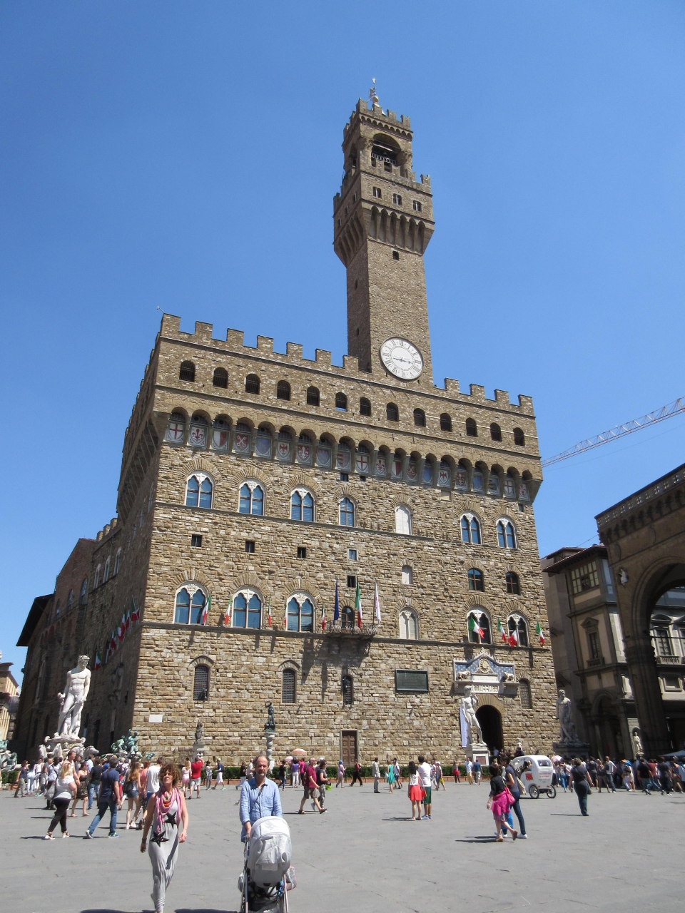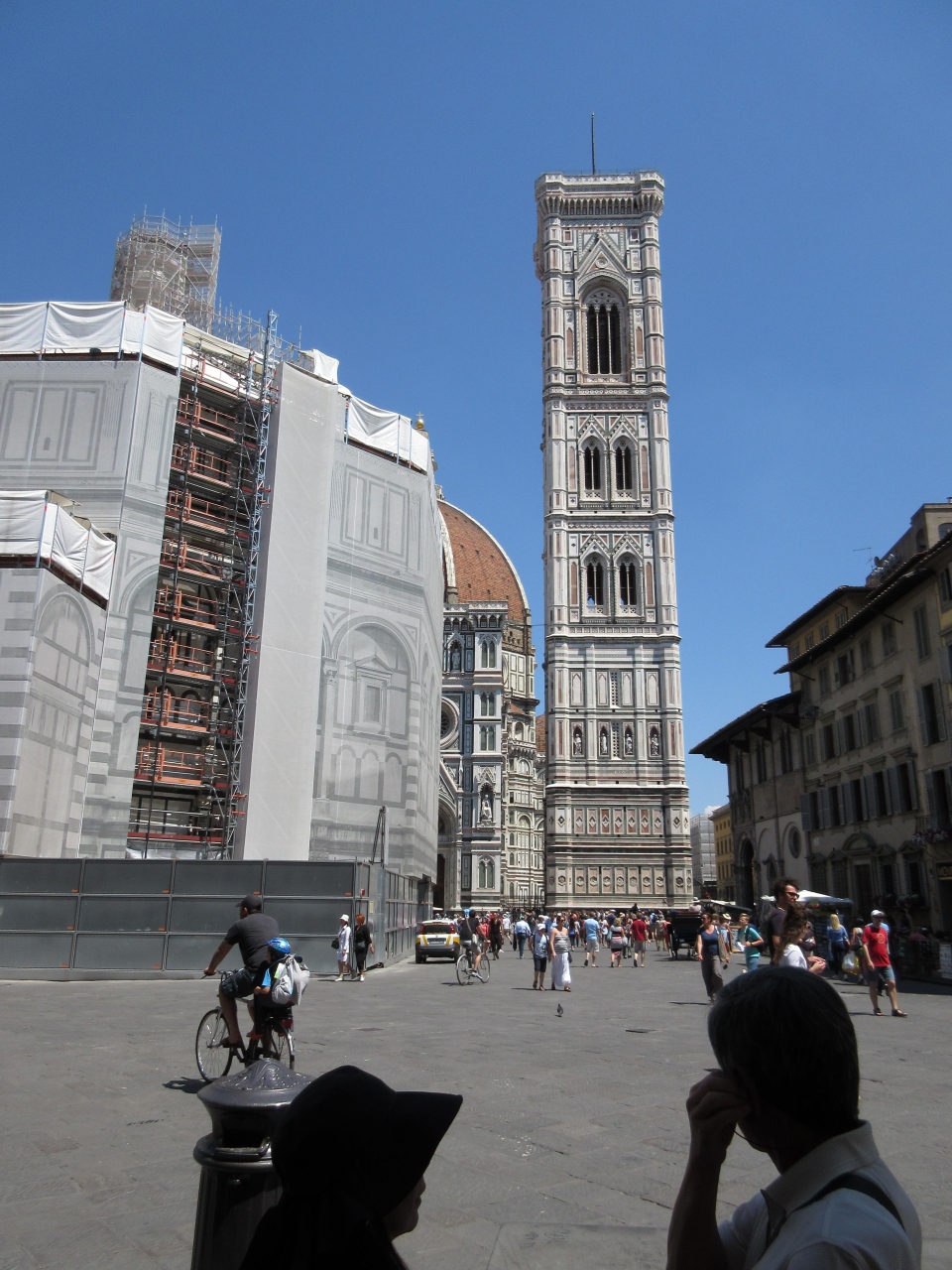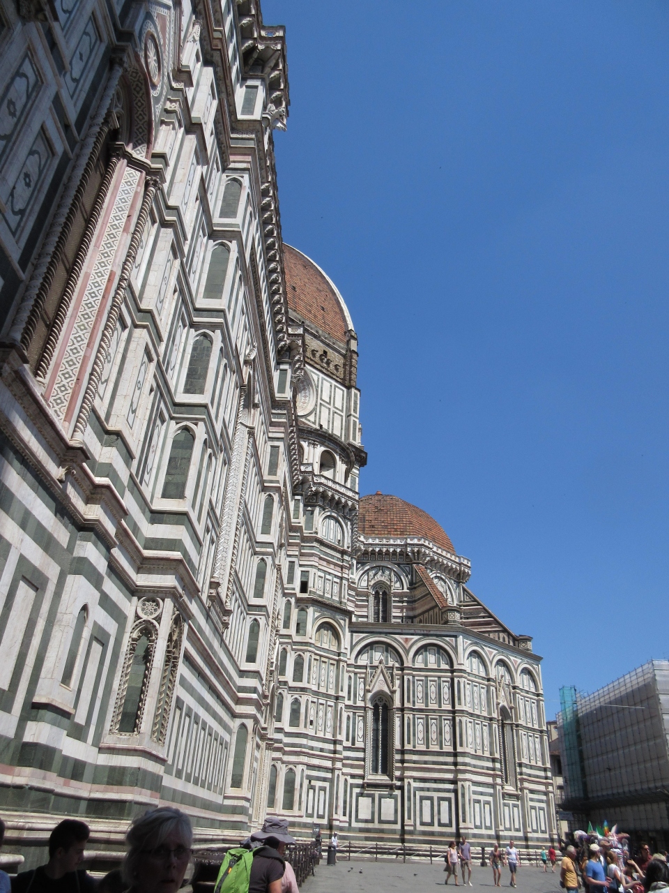 1296年から172年かかって建築された。ゴシック様式で初期ルネサンス建築を代表する建物である。白を基調として緑とピンクの花の色の大理石で装飾されているので花の聖母と言われるのではないかと思う。当時の技術ではクーポラを築くのに足場と仮枠を作ることが困難であり、二重構造にしている。約3万人が一堂に会することができるという。確かに大きなクーポラである。