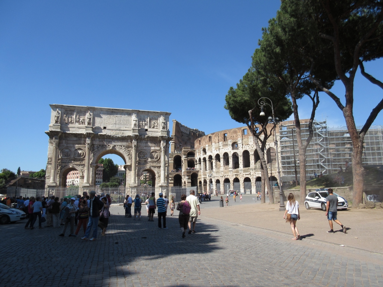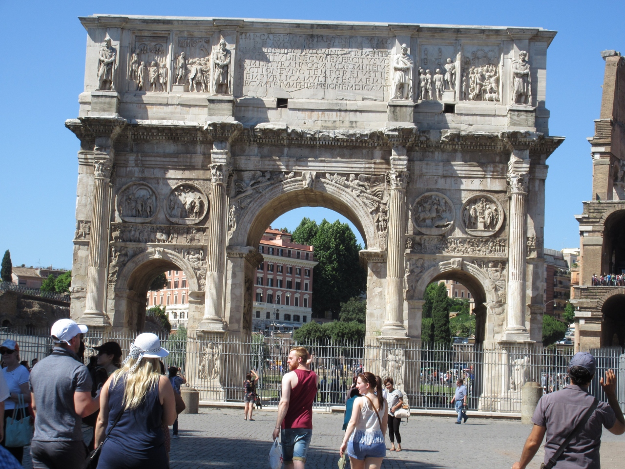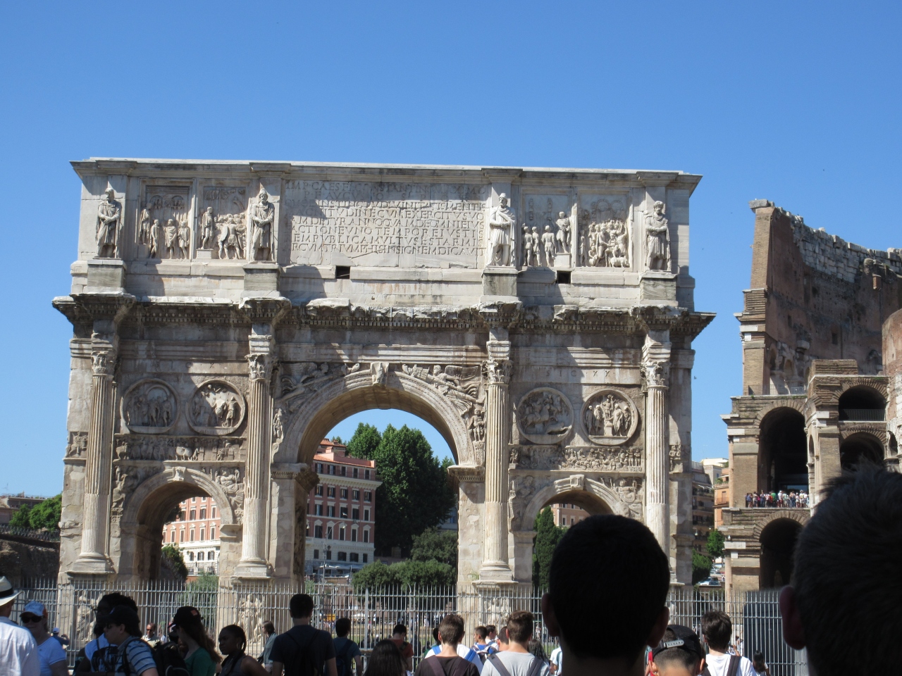 コンスタンチヌス帝がミルヴィオ橋の戦いで勝利して西ローマ帝国の皇帝になったのを記念して作られた。AD315年で1700年も前であることを考えるとよく残っていると思う。コロッセオのすぐ隣にあるが凱旋門を観光の目的にしてくる人は少ない。レリーフは込み入っている。柵で囲まれているので間近で見ることはできない。