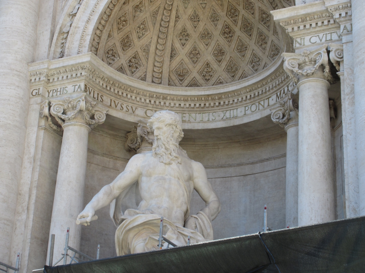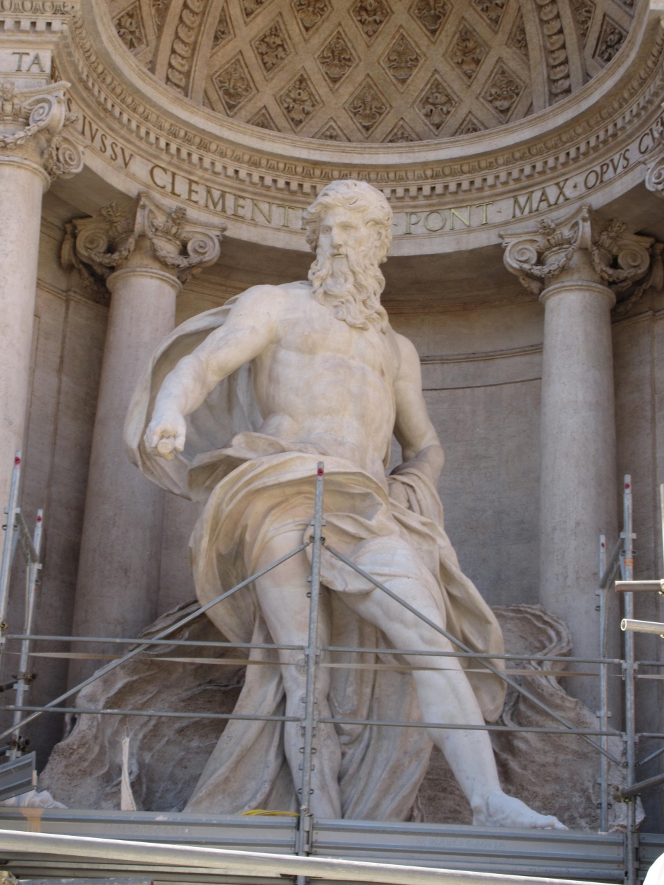 「後ろ向きで肩越しにコインを泉に投げ入れるローマを再び訪れることが出来る」というジンクスは有名です。訪れたときは残念ながら工事中でした。水は抜かれていて、中央のポセイドンを除く像はすべてビニールが掛けられていました。手前に小さな池が作ってあり、その池に向かってコインを投げ入れるようになっていました。2015年11月に工事は終了するそうです。よく調べずに行くとこのようなことになります。ちなみに、私は3回目で4回目はないと思います。