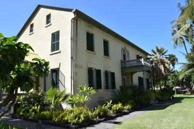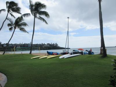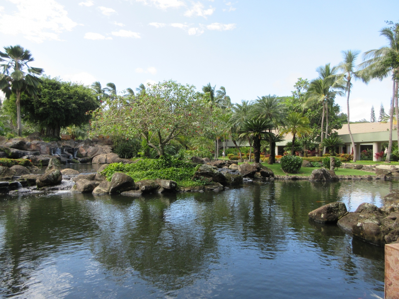 カパラキビーチのほぼ中心に海を臨むとても良いロケーションに建てられている。中庭があり日本庭園があり、小さな階段状の滝から水が流れ、水が流れ込む池には多数の鯉が泳いでいた。ロビーには木製のカヌーが展示されていて歴史を感じさせた。