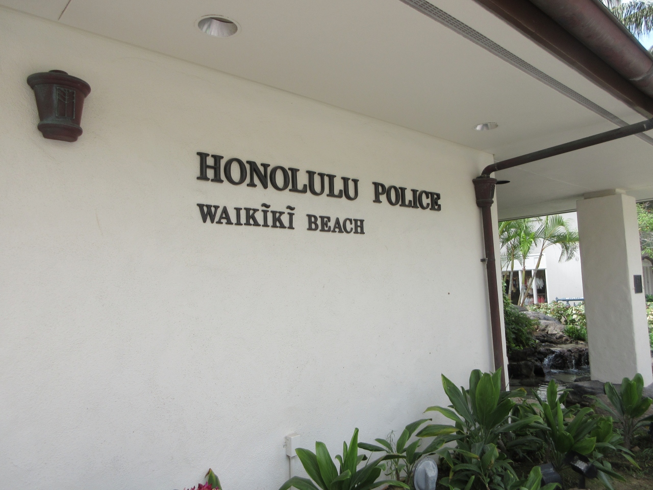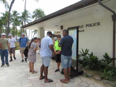 デューク像が見えるワイキキビーチに設置されている。すぐ隣が公衆トイレで治安面でよく考えられていると思う。訪れた時には殉職された方の写真が飾られ、周りには花やメッセージがたくさん寄せられていた。警察官に用事がある人が多いのかいつも観光客らしい人と話していた。日本語が話せる警察官がいるとのことである。