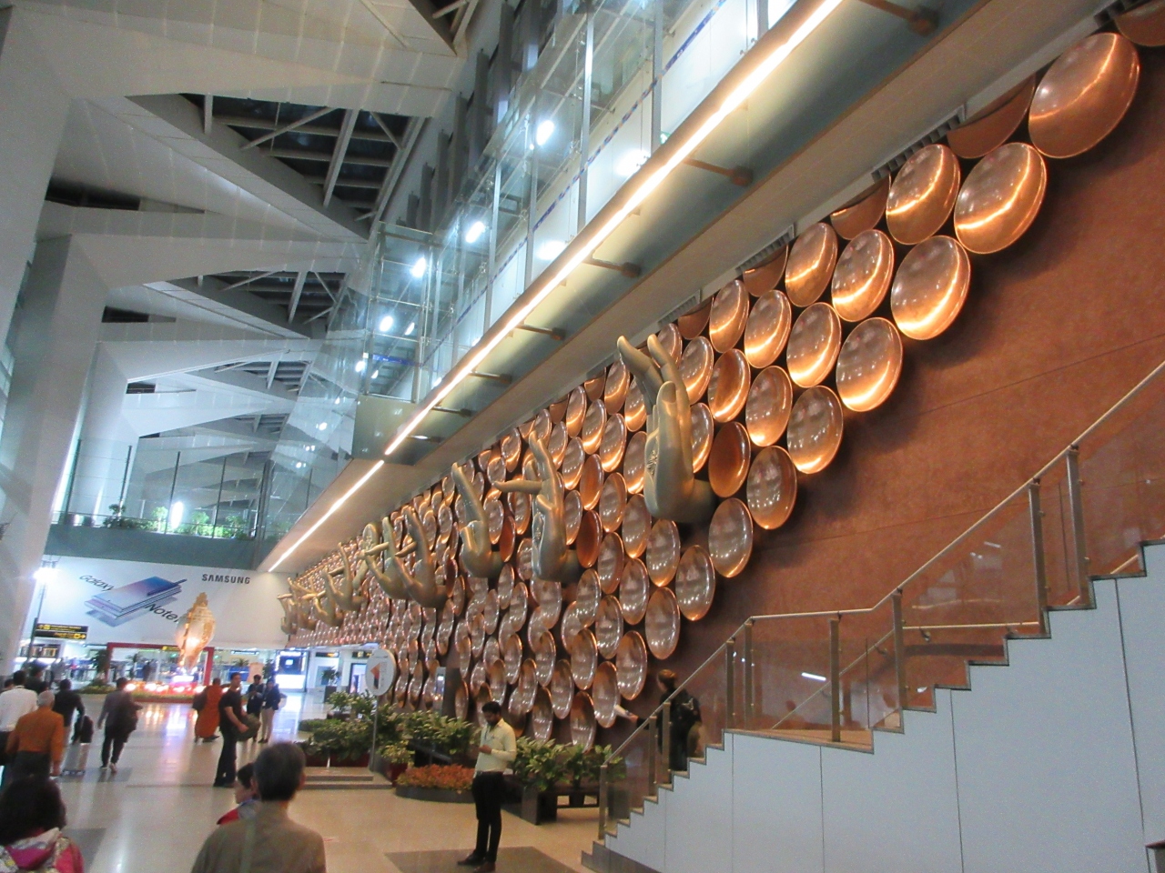特に気になるような設備や改善した方がよいと思われてる設備はない。ごく普通な空港だと思う。到着ロビーから降りてきて壁面の装飾を見て驚いた。お釈迦様の手?のような造形物が壁面いっぱいに飾られていて思わずシャッターを押した。強く印象に残る壁面の装飾である。