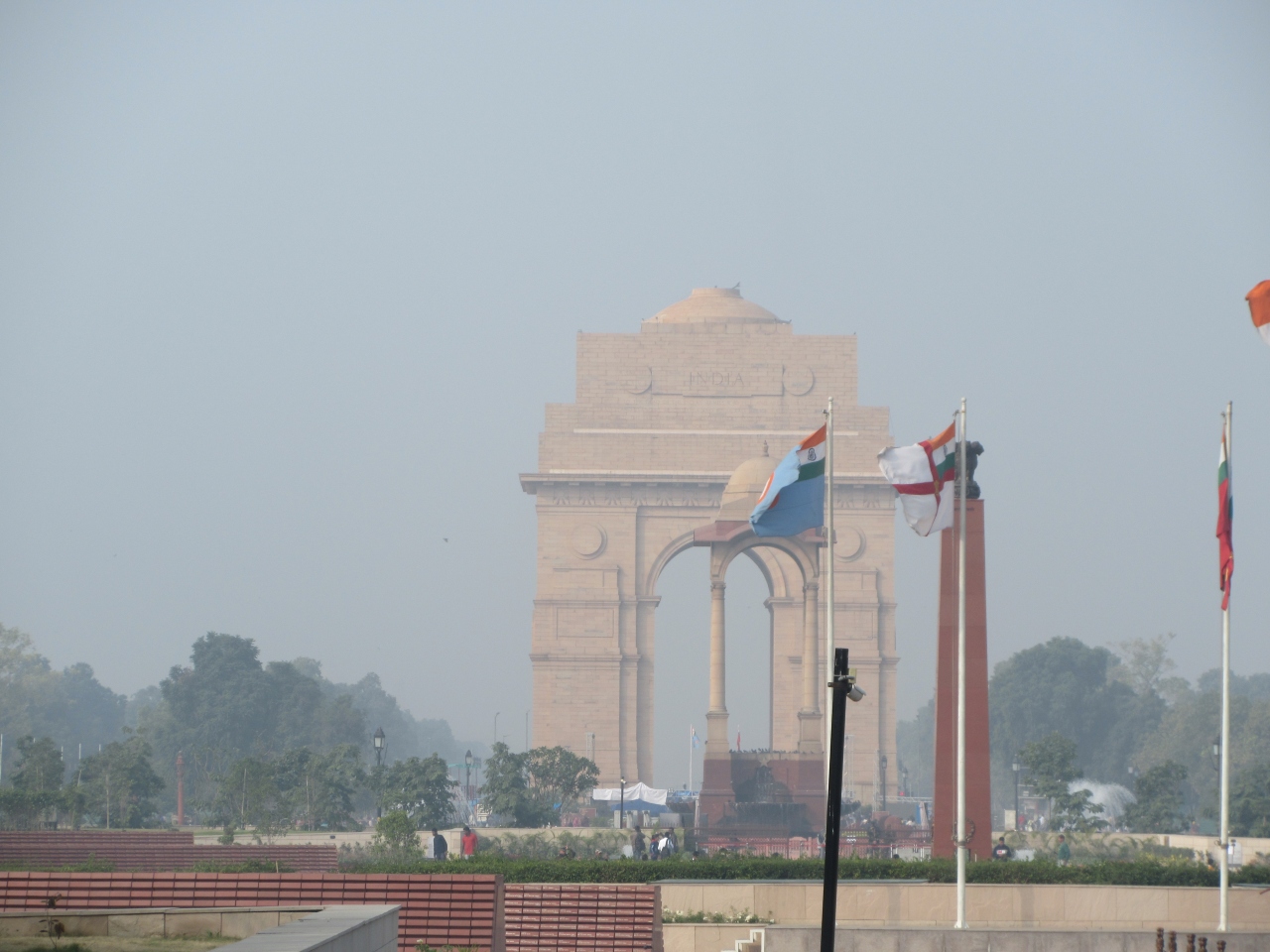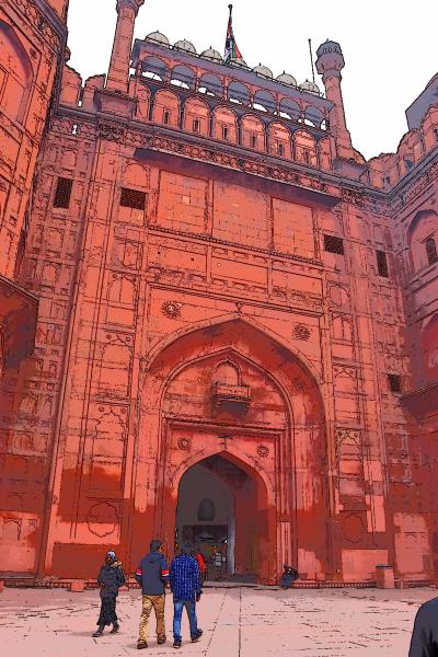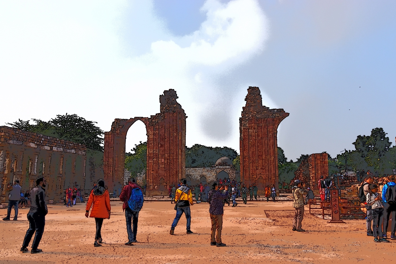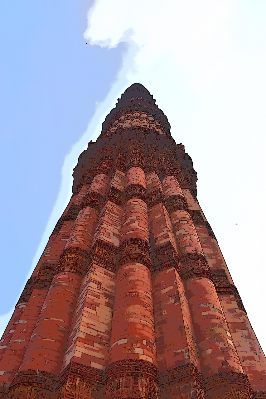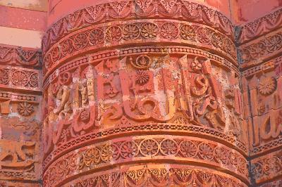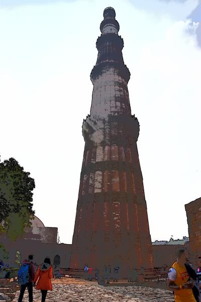 赤い砂岩の高いミナレット。底辺の直径は14.3mあるのでかなり大きい。ヒンドゥー教に勝利したイスラム王朝がモスクと共に建設した別名「勝利の塔」。壁面にはヒンドゥー教のコーランを図案化した模様がある。世界遺産で多くの観光客でにぎわっていた。建てられてから800年近く経つがメンテナンスがよく原型を保っている。