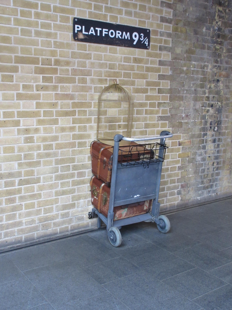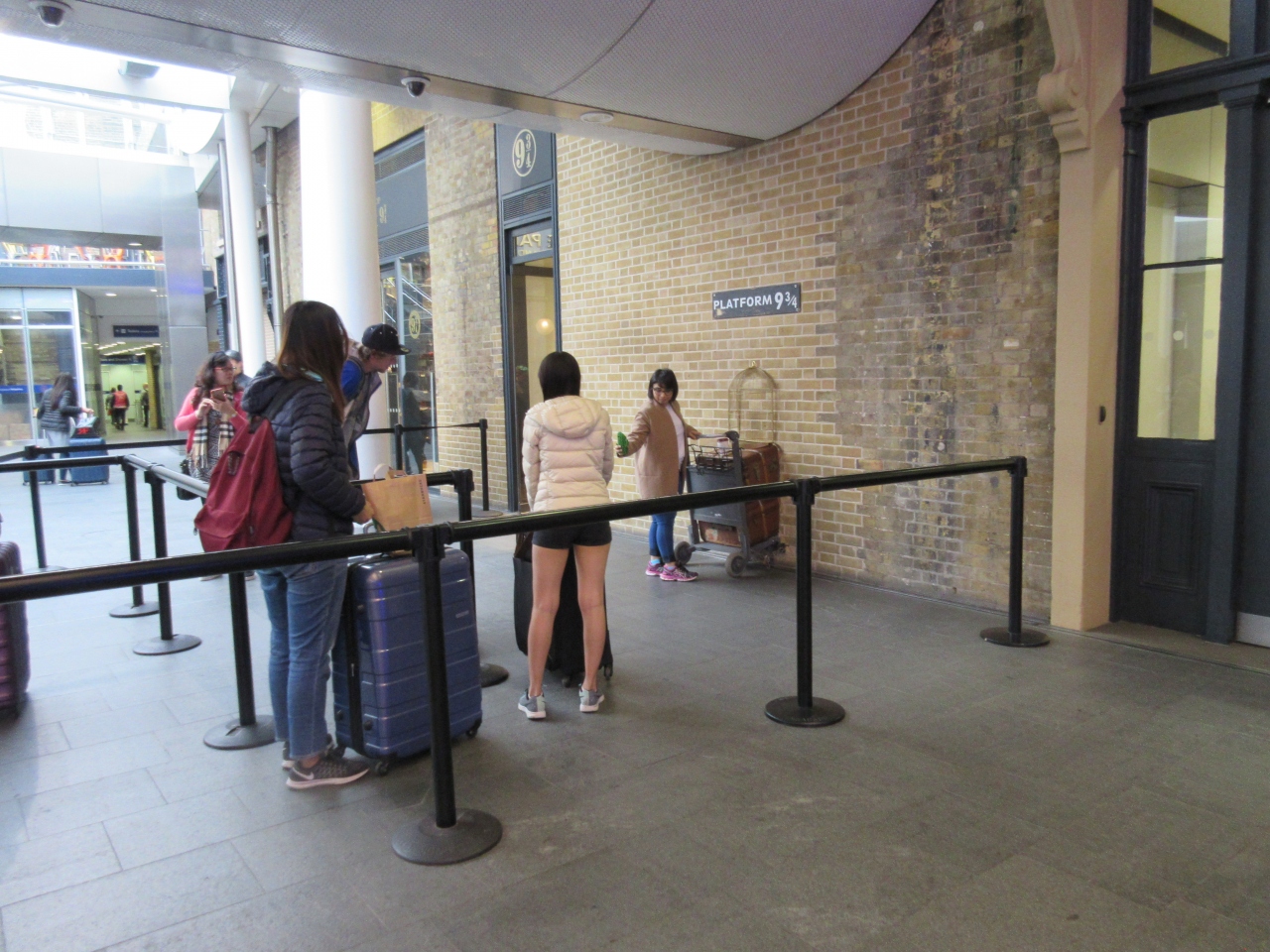 ワゴンの前には長蛇の列ができていることが多い。朝早く(8時前)行くとほとんど誰もいない。ゆっくりと写真を撮ることができる。ホームには入らなくてもよい場所の壁に、半分壁にめり込んだワゴンがあり9と4分の3番線の表示がある。