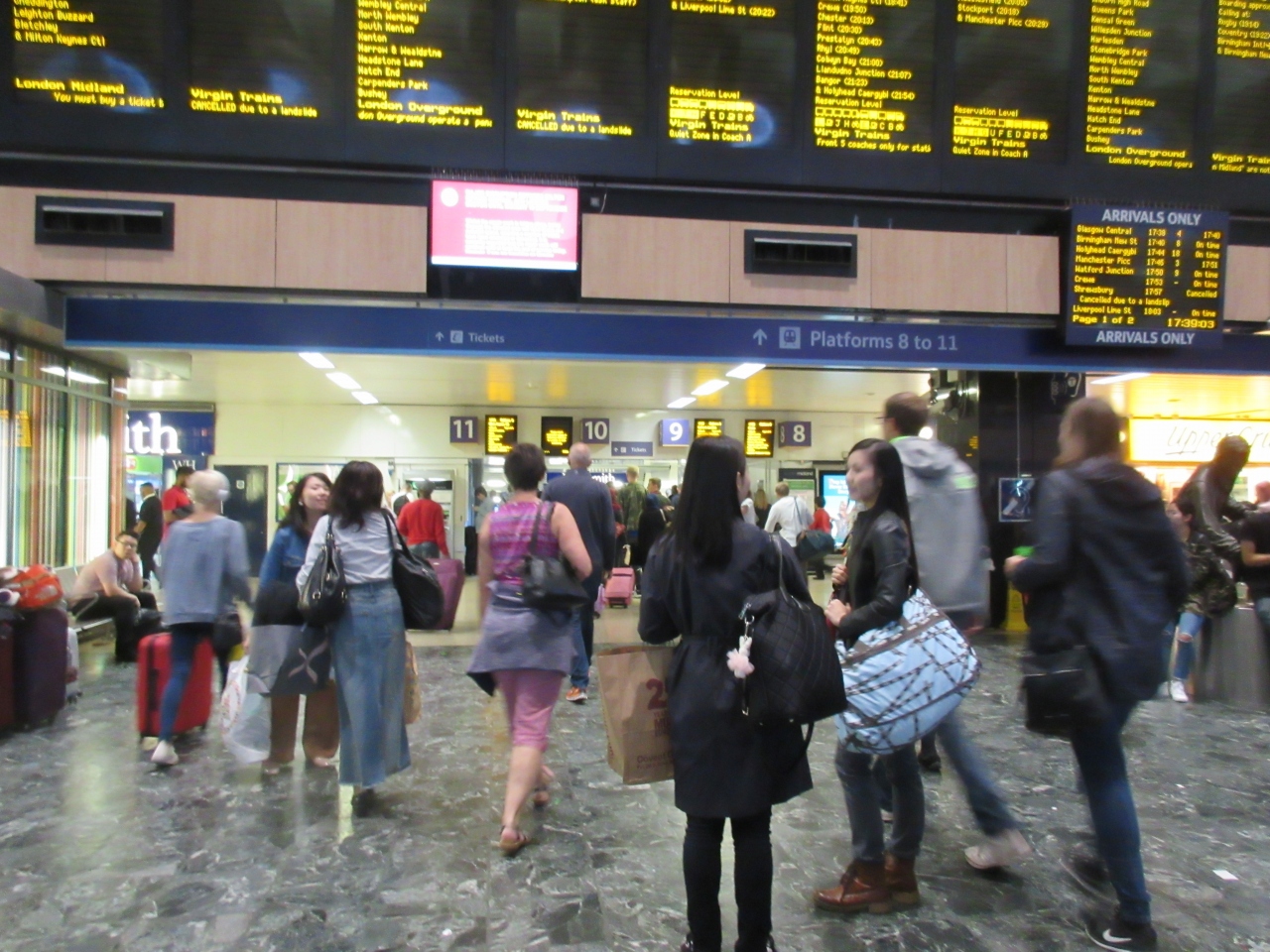チェスターやロンドンからの電車が発着する大きな駅。人でごった返している。大きいのでどこへでも行けそうだが、すぐ近くにあるクイーンストリート駅でないと行けないところがある。地下にトイレがあるが有料0.5ポンド。