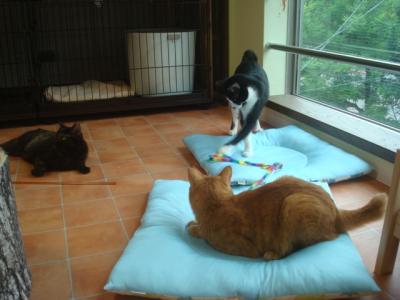 1ドリンク付きですが、最後にペットボトルの飲み物をもらうだけで、店内での飲食の提供はありません。猫に関する本も置かれていましたが数は少なめで、基本的に猫と過ごすための場所です。広くはありませんが予約制で最大4人までと人数制限をしているので、他の客と一緒でも猫とたくさん触れ合えました。