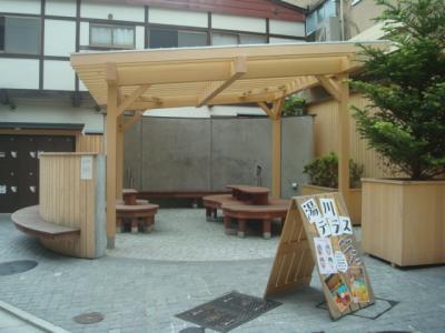 テーブルとベンチ、足湯スペースに「湯川テラス」とありました。湯川テラスのホームページを見ましたら、泊まれるレストラン&カフェとのことでした。足湯だけ入らせてもらいました。群馬名物上州牛ひつまぶし、と大きく書かれていたのでこれが売りのようです。
