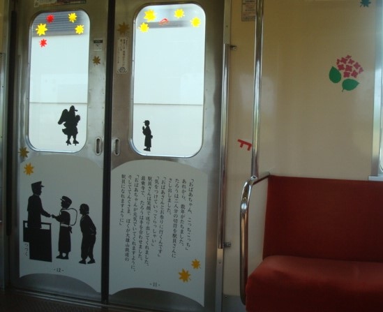 何か特別な列車だったのか、車内ドアには絵本のような文章とイラストが描かれていたり、アジサイのシールが貼られていたりと、楽しい車内でした。- 旅行時期