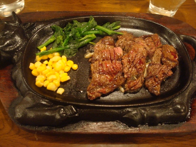 食べたのはカットステーキです。お肉がやわらかかったです。テーブルに醤油ベースのソースや塩が置かれていて、好みの味を探しながら美味しくいただきました。