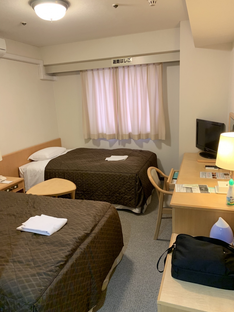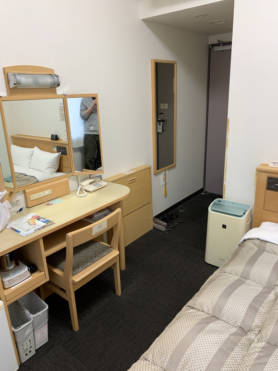 部屋 ○シングルは狭く、机も小さいがある意味機能的