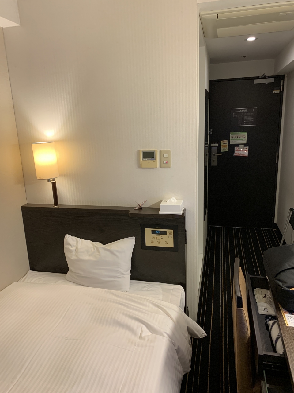 電源やスマホの充電用USBの口も枕元にあって機能的です。フロントの横にドリンクサービスがあり、宿泊者は朝から晩まで使えるので、とても助かりました。