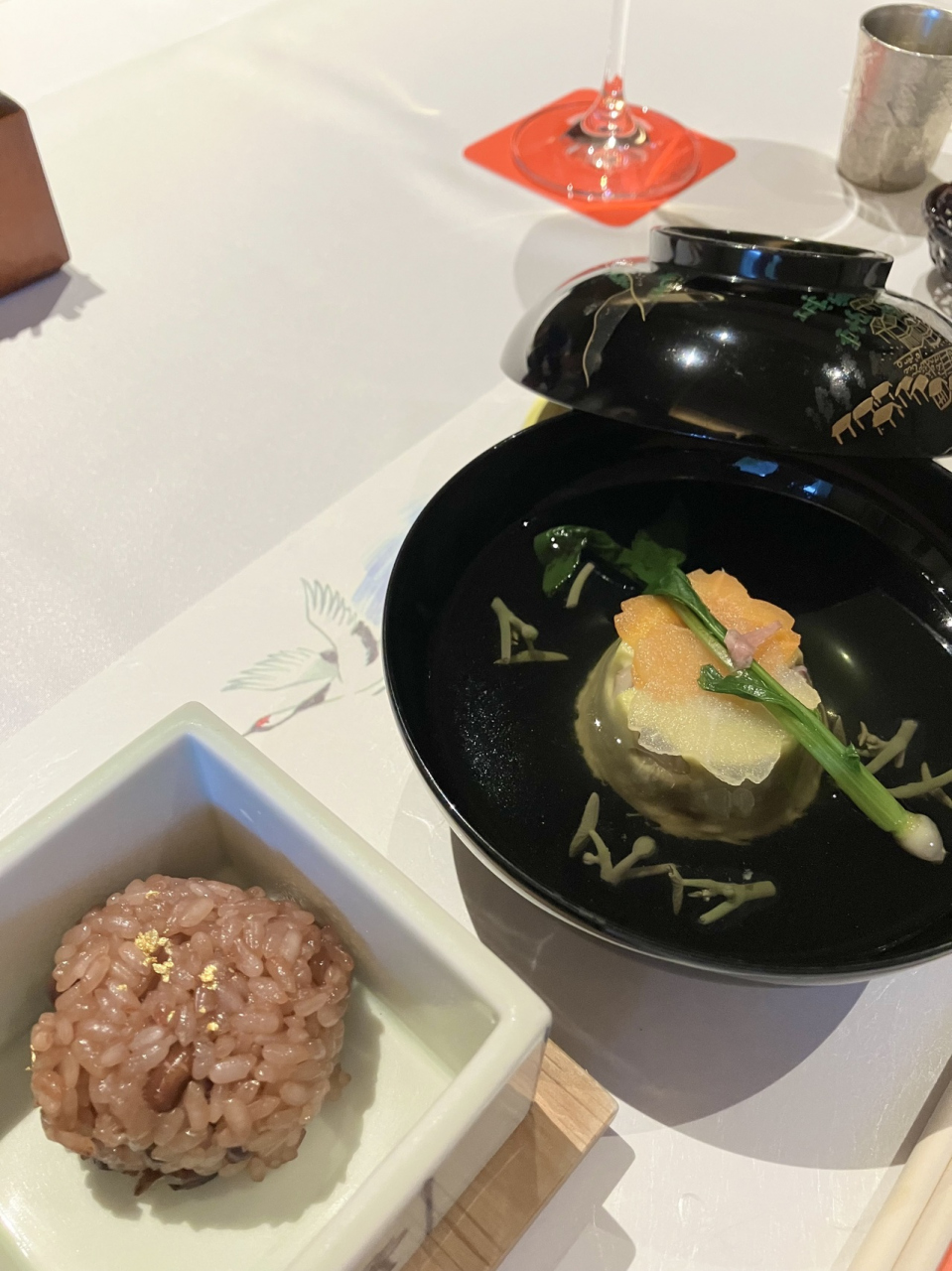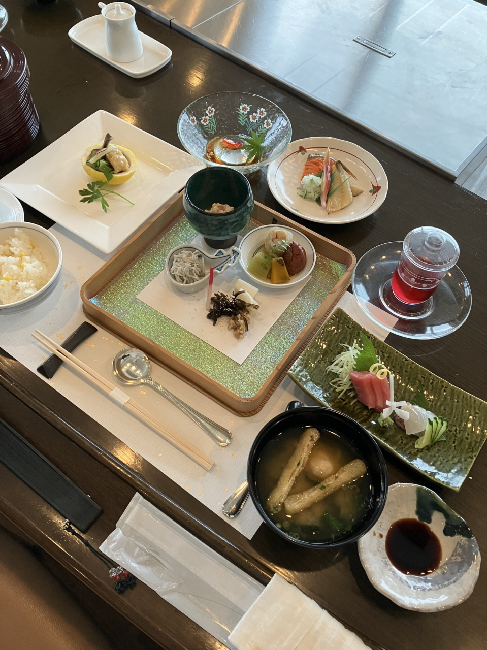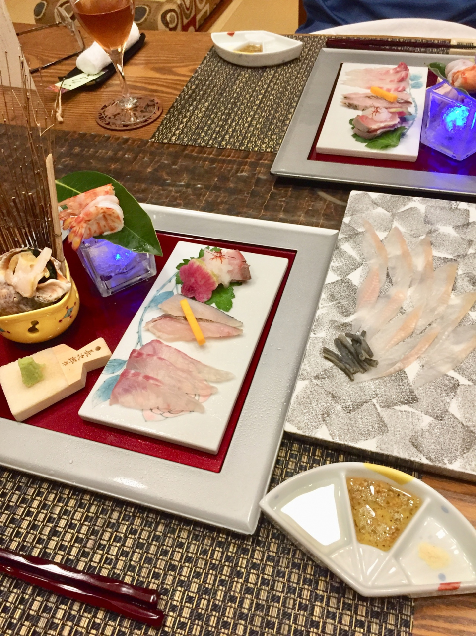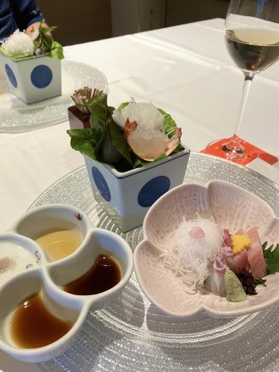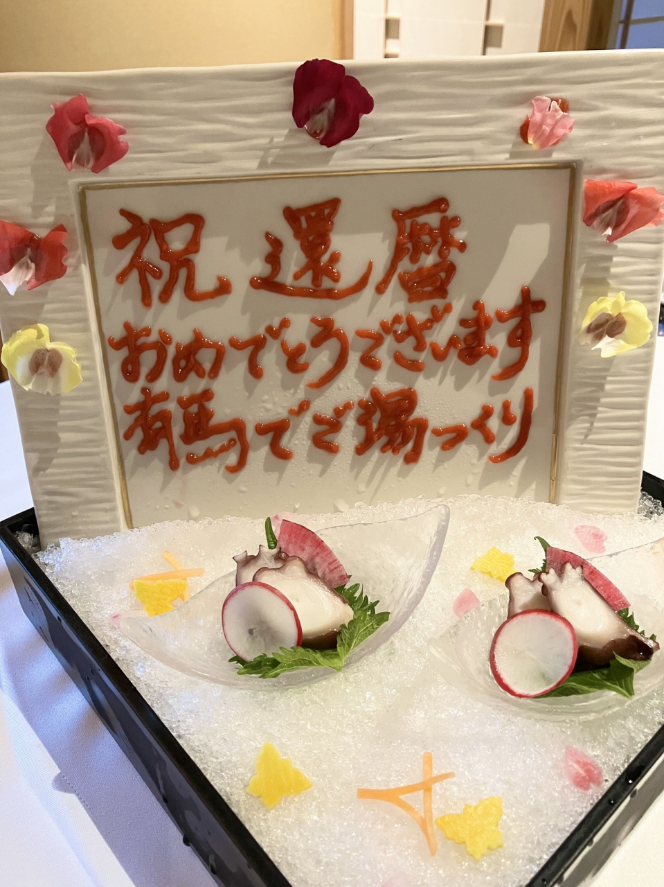 予約時に、夫が還暦の年だと伝えると、夕食時に1人ワンドリンクサービス・熱々の赤飯・明石のタコと梅肉で書かれたメッセージを、更に中庭で記念写真も撮っていただきました。