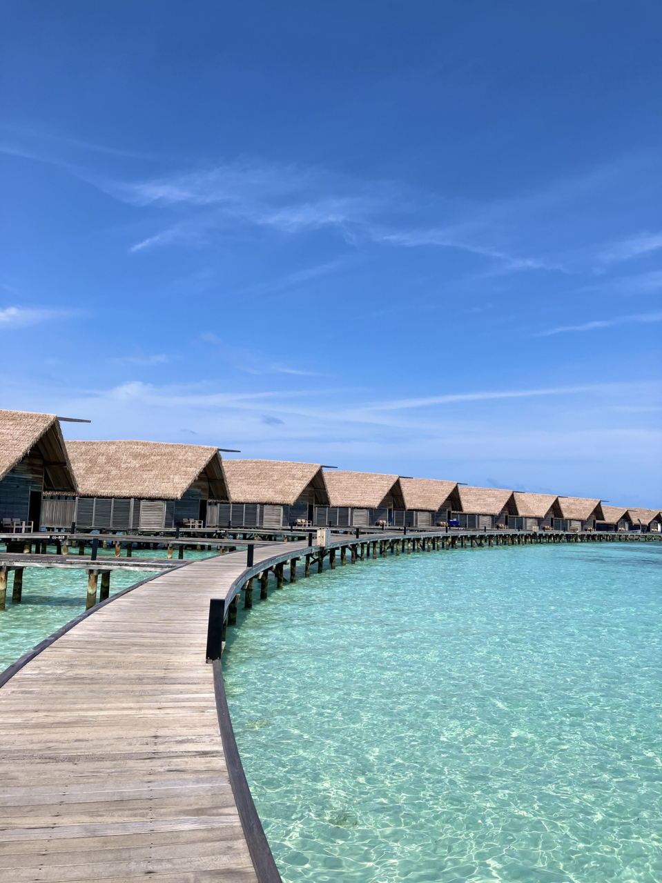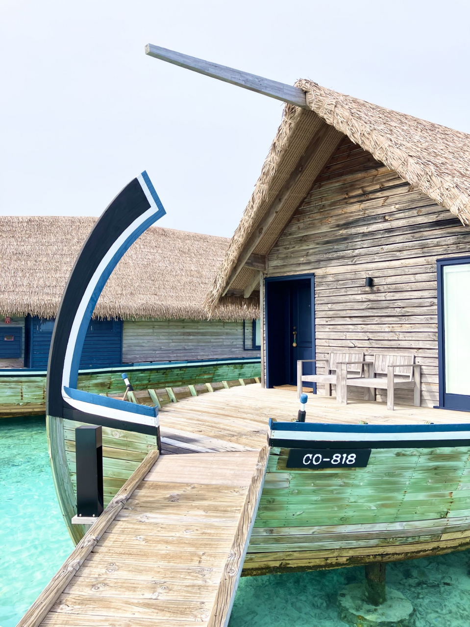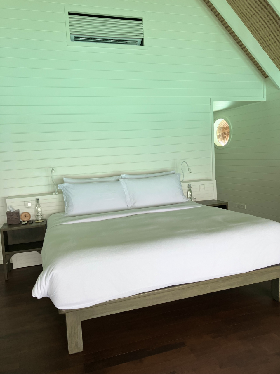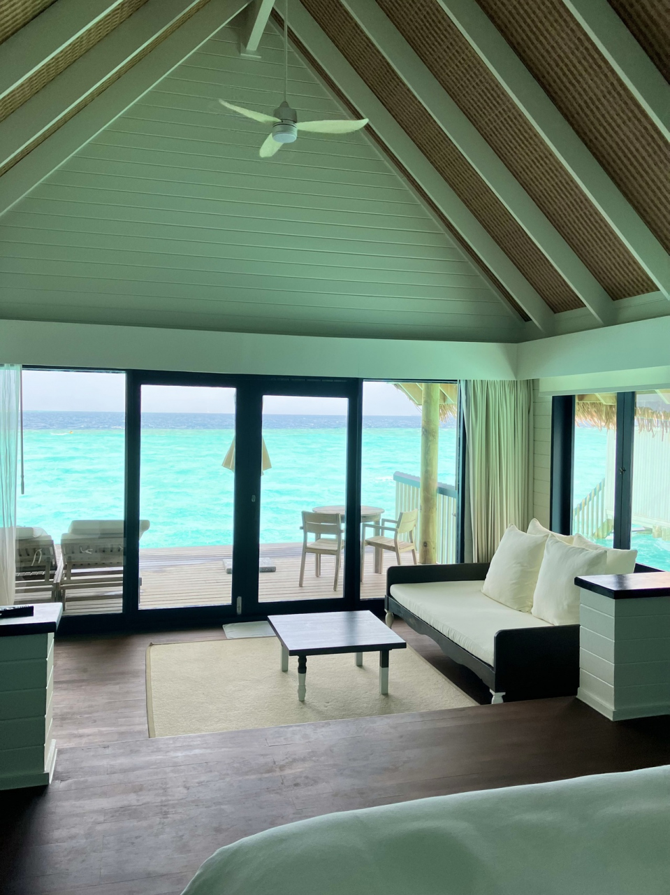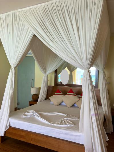 - 古いほうの水上ヴィラは隣から室内が丸見えなので3面の窓の内1面しかカーテンが開けられない