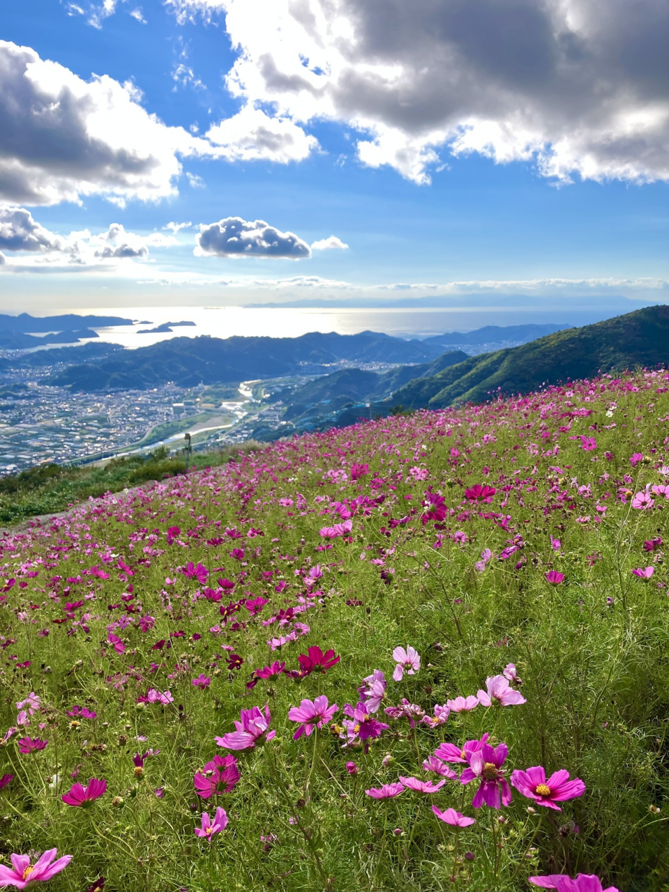 和歌山県有田郡有田川町にある標高586メートルの鷲ヶ峰頂上に位置する入場無料のコスモスパーク。有田ICから約30分せま~い山道を登ると広がる一面のコスモス畑と、遠くは淡路島までのぞめる絶景の穴場スポット。ただし、駐車場(無料)が狭いため週末の午後は山道で渋滞する。平日か、午前中がオススメ。まだ1~2週間はコスモスが開花していると思います。