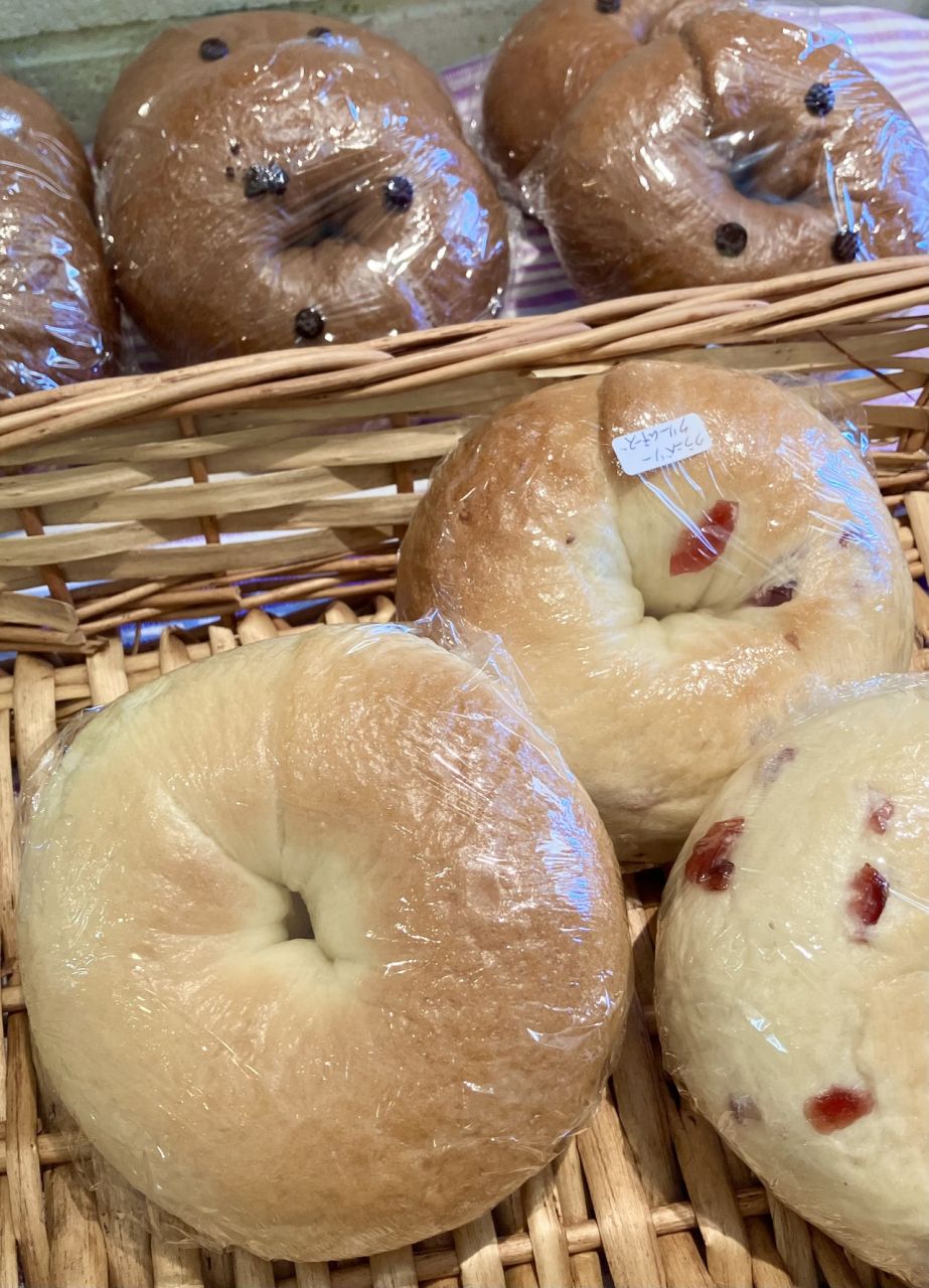 販売のベーグルは1つ220~330円でプレーン・グランベリーとクリームチーズ入り・ほうじ茶とホワイトチョコ入りなどずっしり大きくもっちもち!