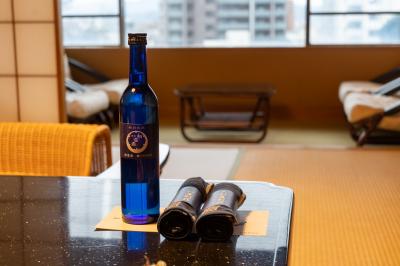 今回、お土産にもらえるオリジナルの手拭いと特製日本酒のブルーボトルも素...