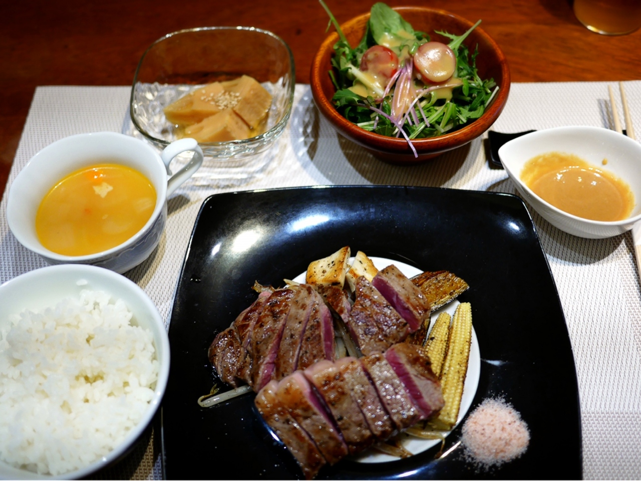 メインのサーロインステーキは、オーストラリア産ということもあり、肉の旨味、脂身の甘さはもう一つといったところですが、添えられた岩塩とソースで美味しく頂きました。