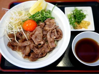 うどんの上に、黒毛和牛のお肉、白髪葱、青葱、色の濃い卵、レモンのトッピング。