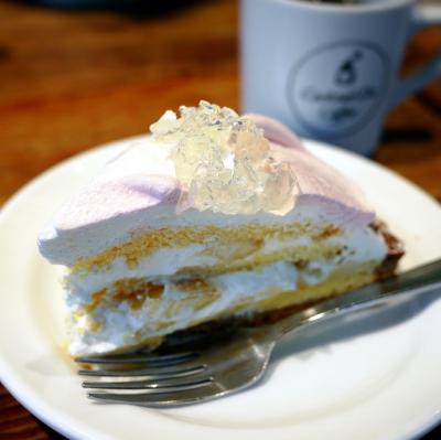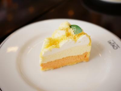 桃のショートケーキは、下がサクサクのタルト生地に、シフォン生地と生クリームで構成されており、大きめにカットされた桃もたくさんサンドされていました。トップの生クリームは、ベリー系でほんのり酸味がありました。