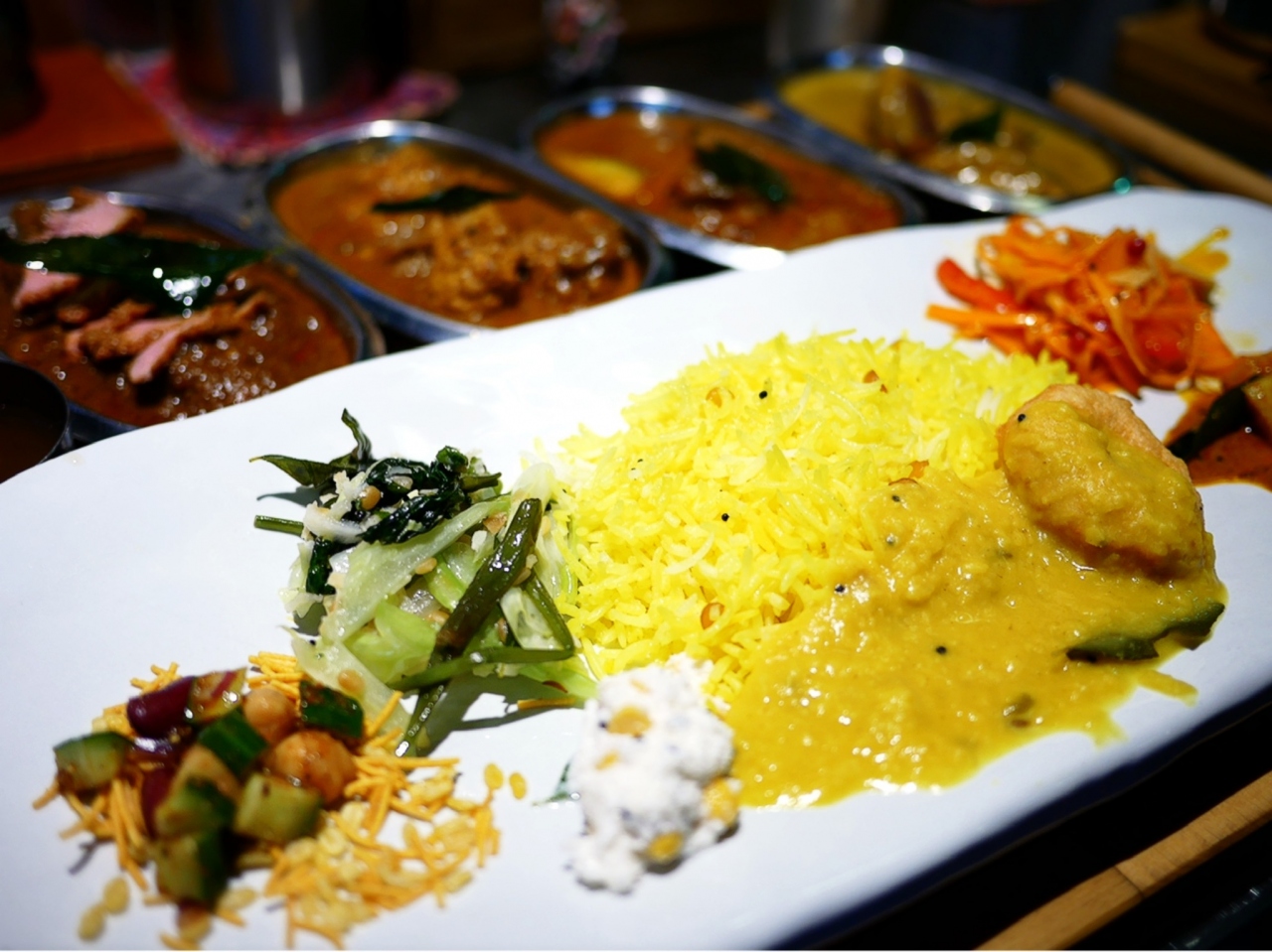 カレーは、チキンマサラ、ベジマサラ、フィッシュ、スモークラム肉ビンダルーの構成。どのカレーも美味しく、甲乙つけ難い。辛さは殆んど無く、スパイス感も強くありませんが、具材の旨みが良く引き出されているカレーでした。