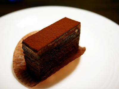 ---カカオ豆を使用したチョコレートケーキ。スポンジにもしっかりカカオの風味があって、チョコレートクリームとガナッシュの多重奏が素晴らしい。濃厚なチョコレートでありながら、決して重くない所がショコラティエの腕なのでしょうか。