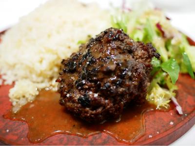 メインのハンバーグは硬派系で、好みのタイプ。噛み応えがありましたが、スジ肉がかなり多めなので、食感が良くないですね。スジは煮込んでタネに混ぜるなど工夫が必要と思います。