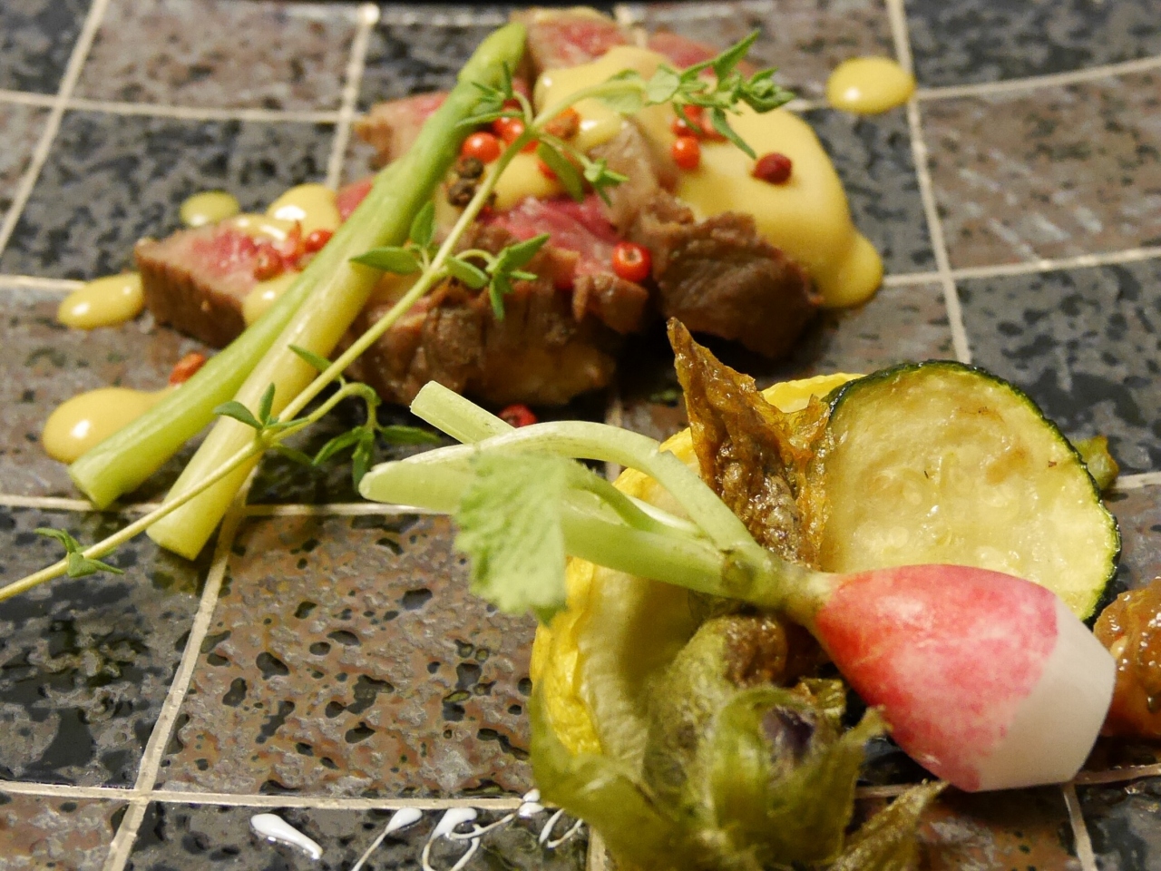 ●強肴<牛肉和風ロースト 花オクラ アスパラ 紅白大根 ズッキーニ 胡麻味噌>