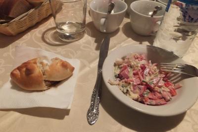 サンクトペテルのディナーは初日つぼ焼き(ジャガイモに肉を温めた壺で)2日目がここでピロシキ(冷めた小さめのパンの中に炒めたキャベツにひき肉を詰めたもの)