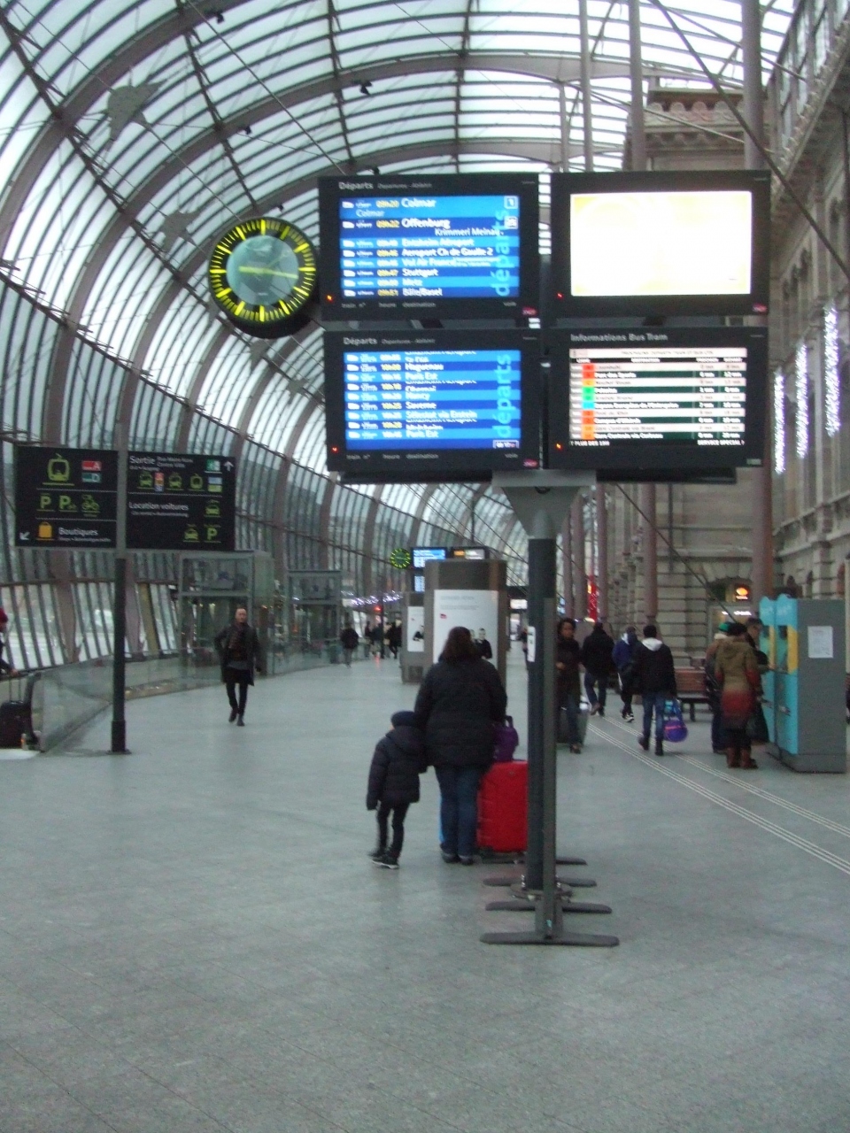 パリ東駅から、ストラスブールとランスへ行くのに利用しました。レイルヨーロッパで早割の座席を買いました。自宅で印刷でき、当日も刻印の必要はありません。手数料がかかりますが、日本語でOKなところが便利です。2等車ですが、座席の広さも十分です。ただ、スーツケース置き場は車内中央に少ししかありません。座席上部の棚も狭いためSサイズのスーツケースなら収まると思います。大きな荷物がある場合は、1等車の方が良いかもしれません。各駅には、売店やカフェも多いので、電車に乗る前に買い出しもできます。ホームの掲示板もいたるところにありました。東駅へはメトロを使っていきましたが、改札出るとポールのパン屋やコンビニがあり、さらに上に行くと地上階でした。旅行客も多いので大荷物の方もたくさんいました。