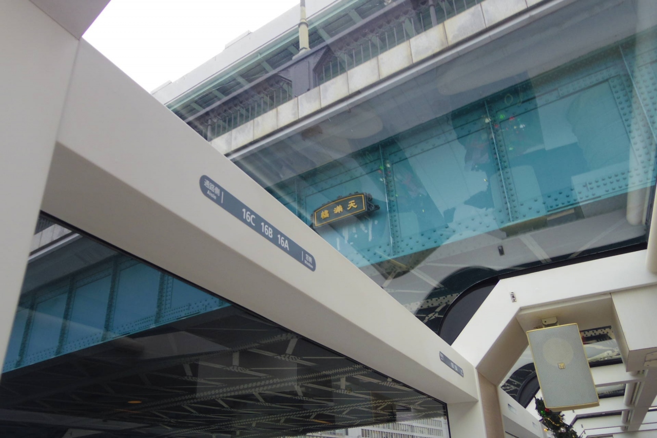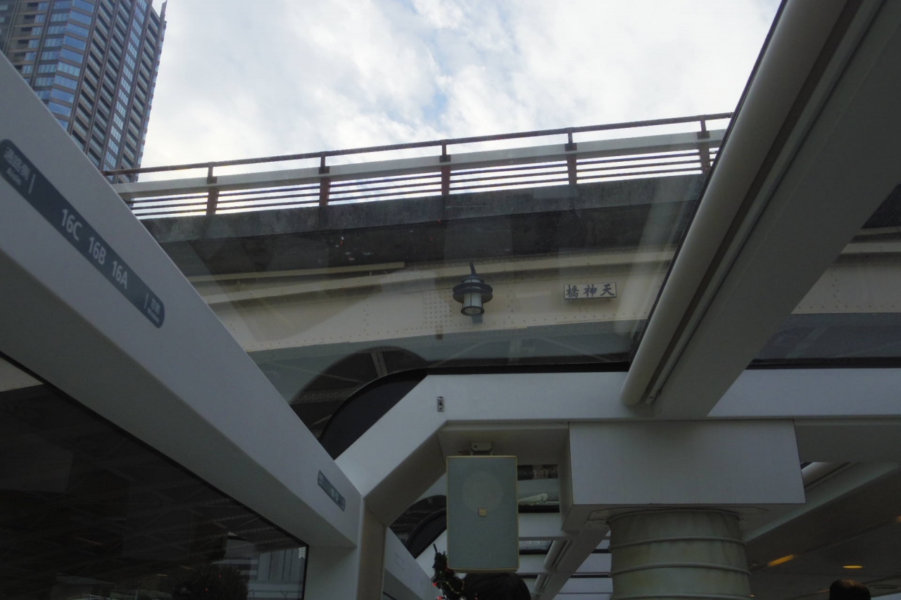 天神橋筋で名前はとてもよく聞く有名な橋で中之島の東端あたりに位置し過去には歩いて渡ったこともあっただろう天神橋を今回はアクアライナーに乗って潜って見ました。橋の上からは絶対見えないところに天神橋と橋の名前がかざられていました。