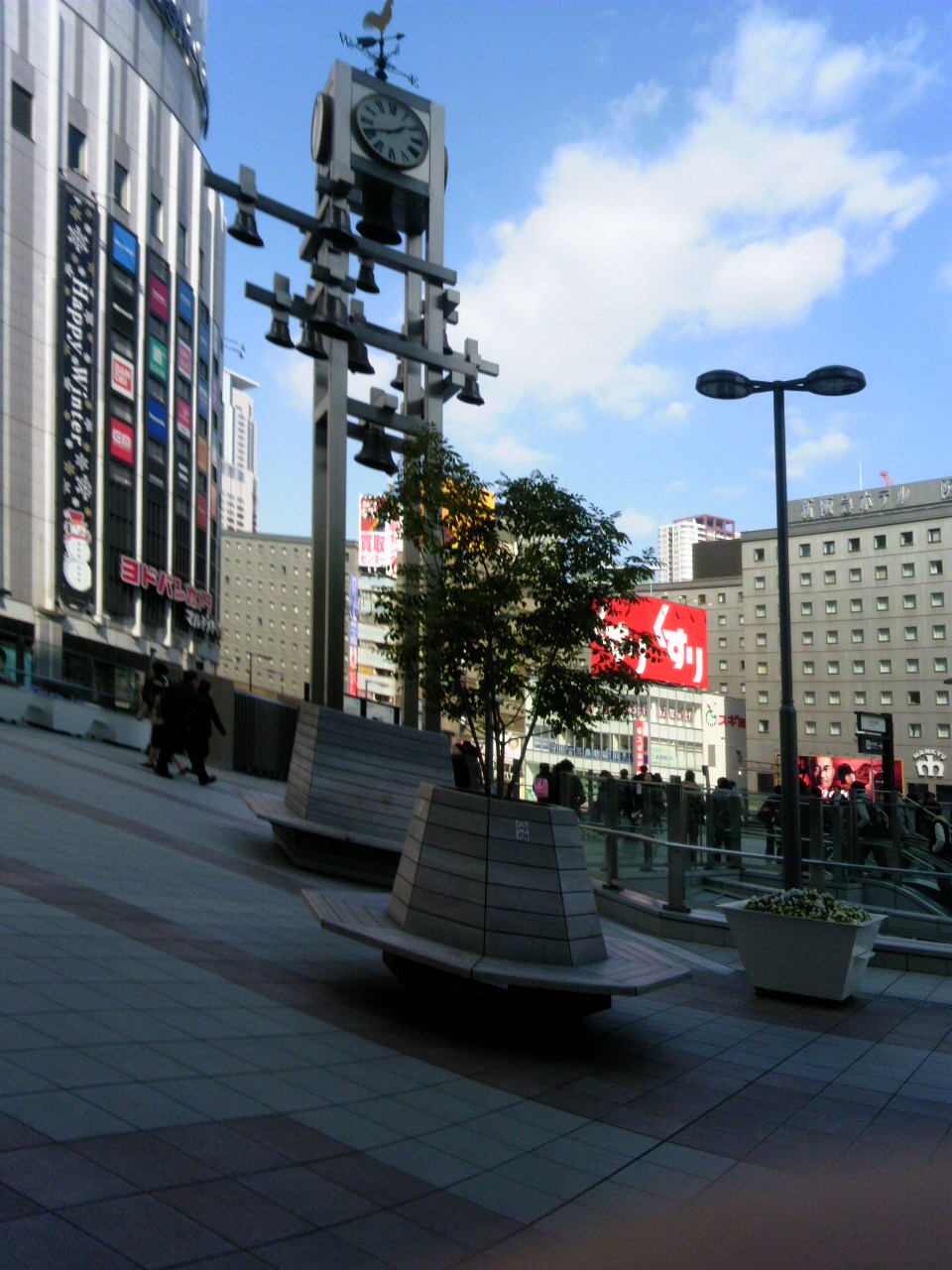 ノースゲートビル2階から道路をまたぎ阪急梅田駅方面へ向かうところにある広場ですが、広くはないです。時計が目印にはなると思います。JR大阪駅方面から来た人がエスカレーターに乗って阪急へといくので、阪急とJRの友達同士の待ち合わせには良い場所かもしれません。