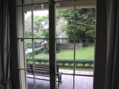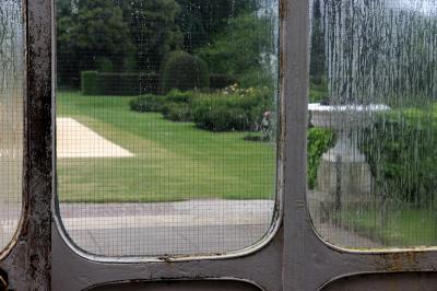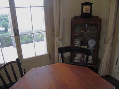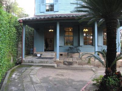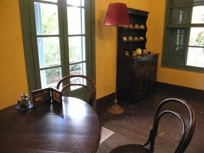 門と同じ渋いブルーの建物は2階建てで自由に見学出来ます。内部は当時を思わせるような調度品も置かれ、また外側はベランダや緑に囲まれていて、前庭のイスとテーブルも良い雰囲気です。