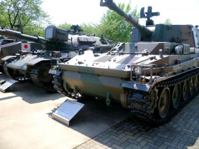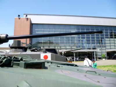 入場は無料。まずは中庭の展示を見に行きます。普段触れる事が無い迷彩色の戦車、自走砲、高射砲 etc が並んでいますよー。中庭の展示を見た後は、屋内展示です。