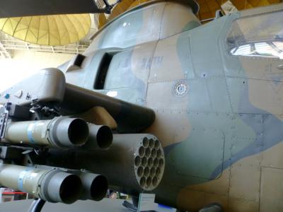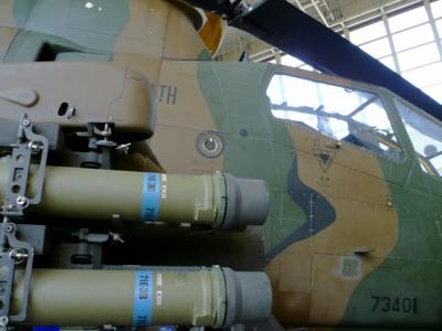 屋内と言っても体育館以上もありそうなスペースに、戦闘ヘリや戦車なども置いてあります。シミュレータには列が出来ていますねー。その周囲には各種の装備や武器なども展示してあり、大人も飽きずに居られると思いますよ。また2Fにも資料展示などがありますから行ってみて下さい。