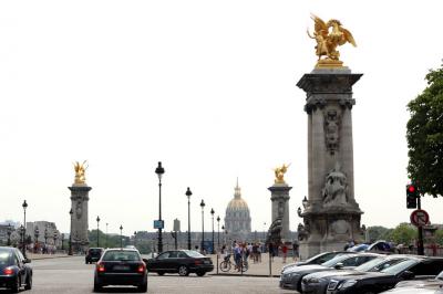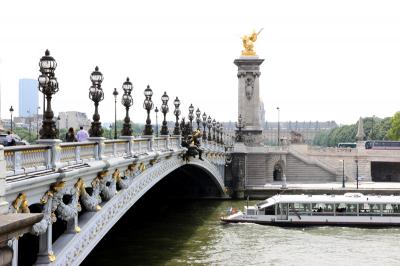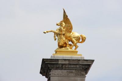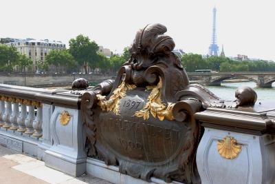 アレクサンドル?世橋は、アンヴァリッド広場とグランパレ、プティパレの間を結ぶようにセーヌ川に架かっている一際豪華な橋です。ロシア皇帝から1900年のパリ万博に合せて建設・寄贈されたもので、橋の上の街灯、欄干・アーチのブロンズ像などで飾られ、塔の上の金色の彫刻が青空に映えています。