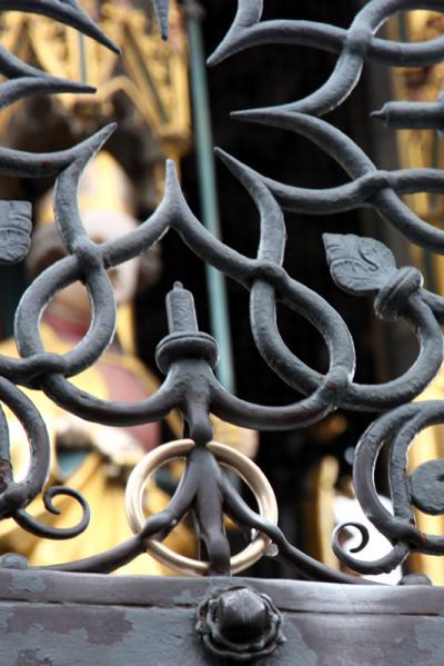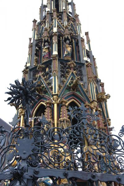 美しの泉。と言うより塔の下は井戸とのこと。尖塔のような形の塔には王様や英雄の像で飾られています。塔は鉄の柵で囲まれていますが、その柵に金の輪っかが付いていて、3回転回しながら願い事を唱え、それを口外しなければ叶えられるt言われている。