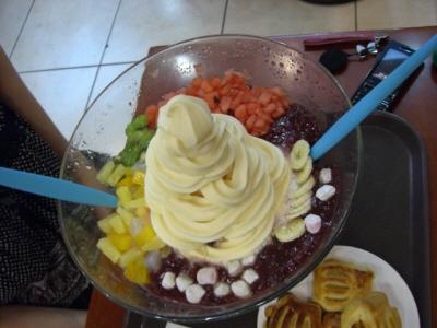 パッピンスは韓国を代表するスイーツ。日本の一般的なカキ氷と違って、果物やアズキ、ソフトクリームなどを混ぜ混ぜして食べるのが韓国の伝統スイーツ パッピンスです。韓国人は、ビビンパのように何が何かわからないくらい混ぜて食べます。見た目は、悪くても味は格別だとか…。