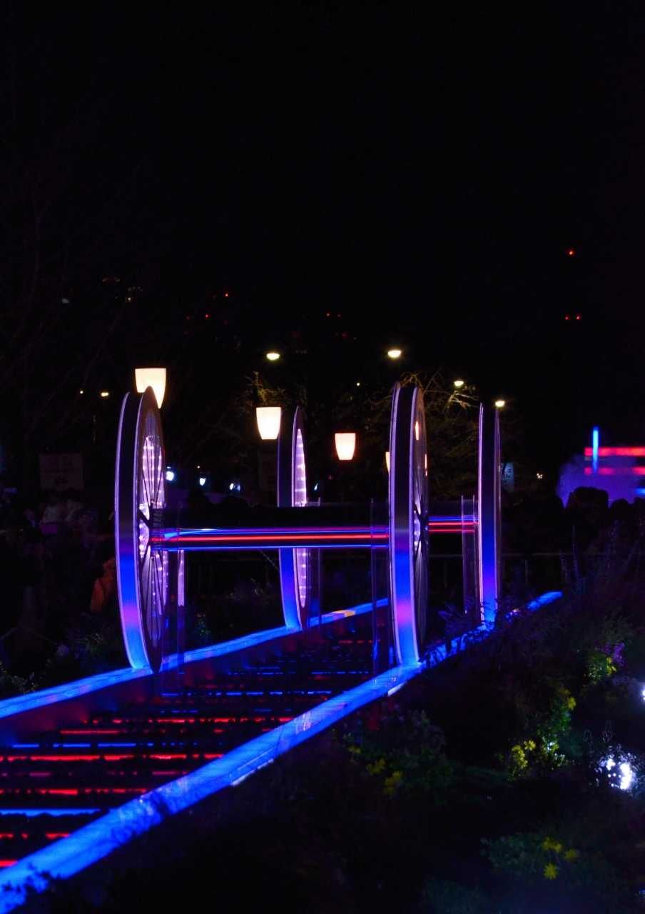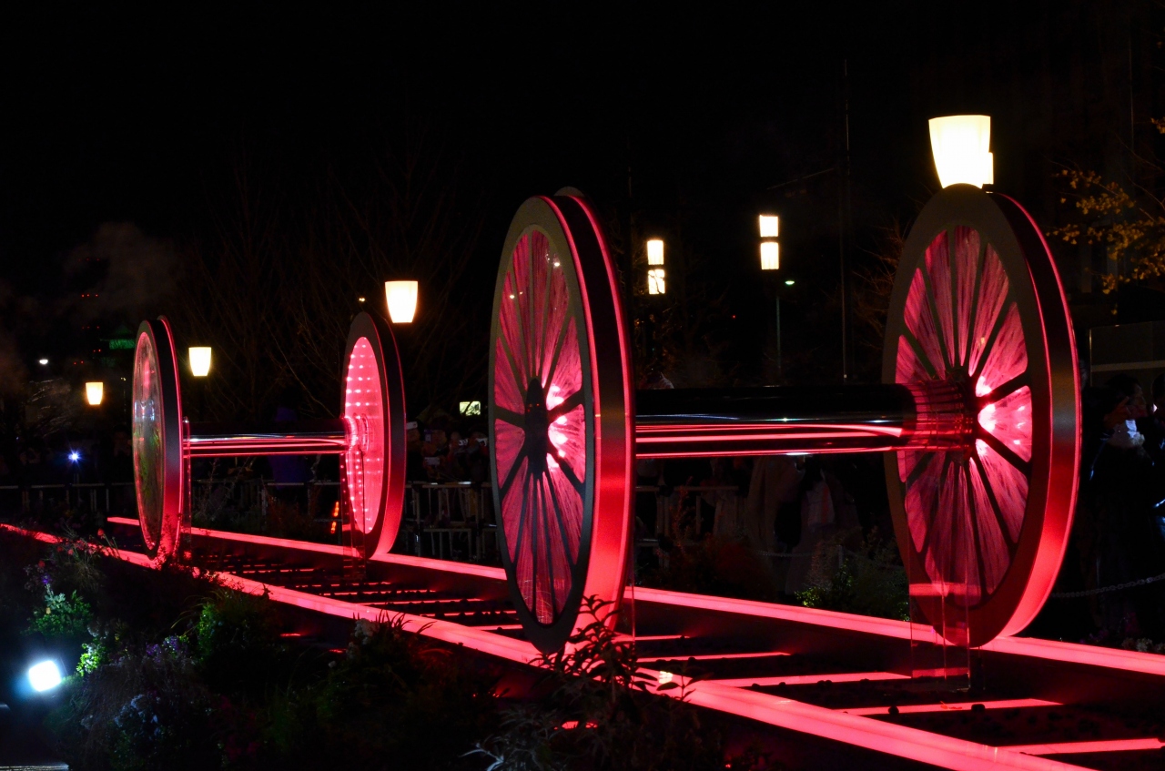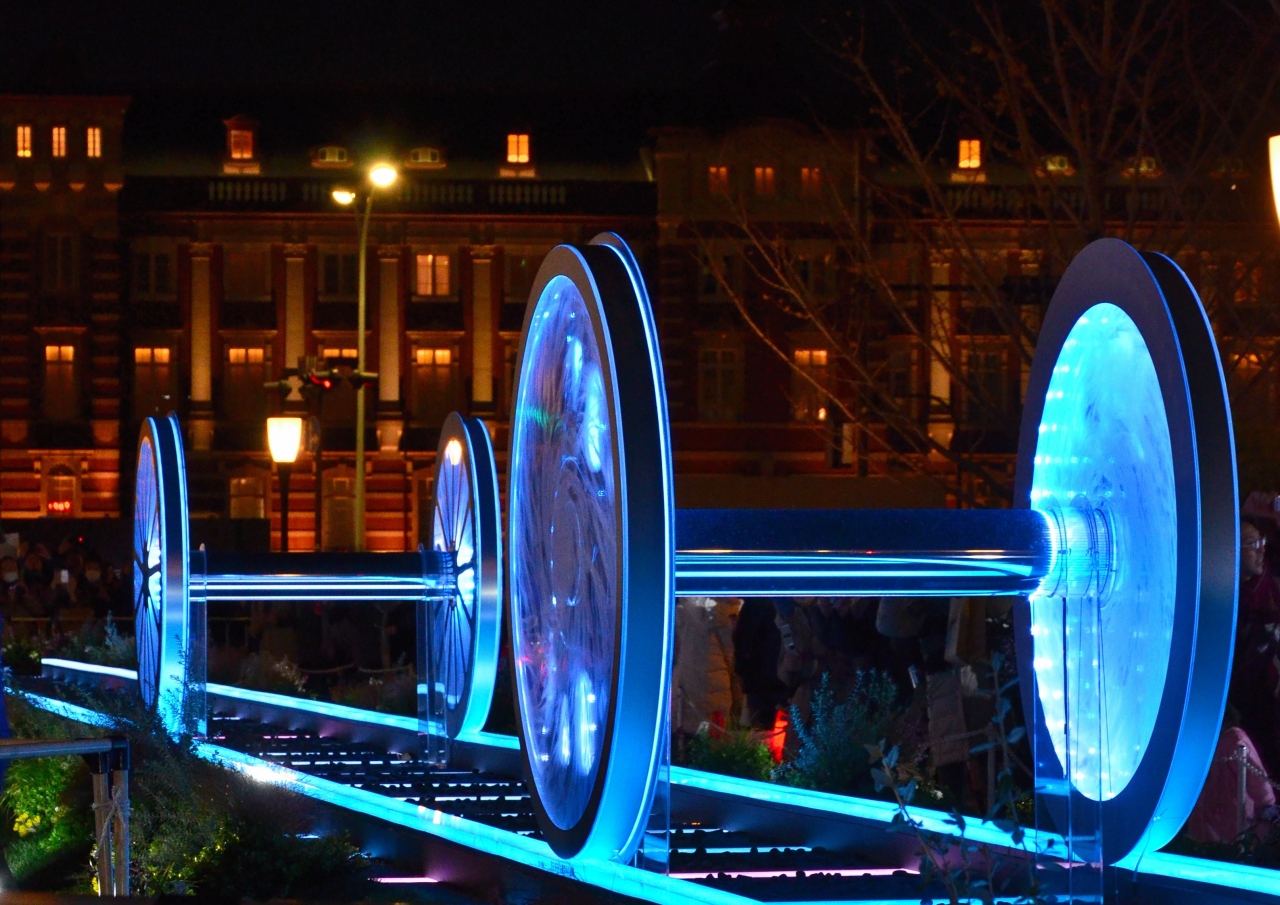 レールの上に置かれた大きな車輪が七色にライトアップされ、