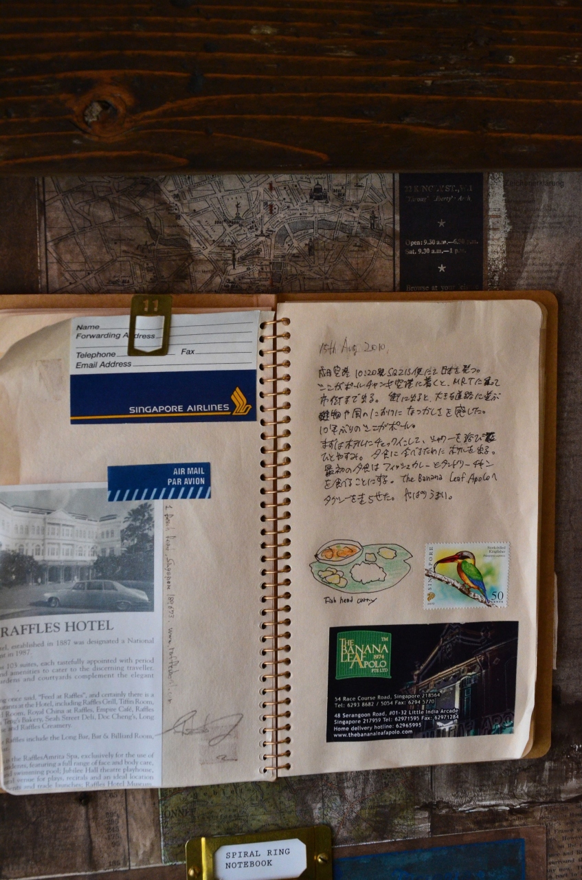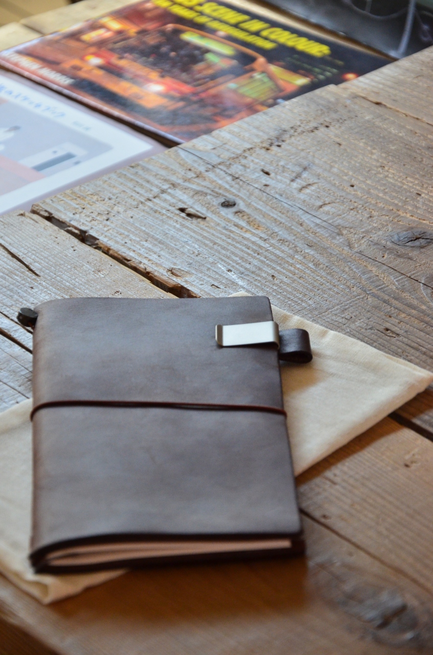皮の表紙に好みのノートを組み合わせ、手書きで旅の思い出を