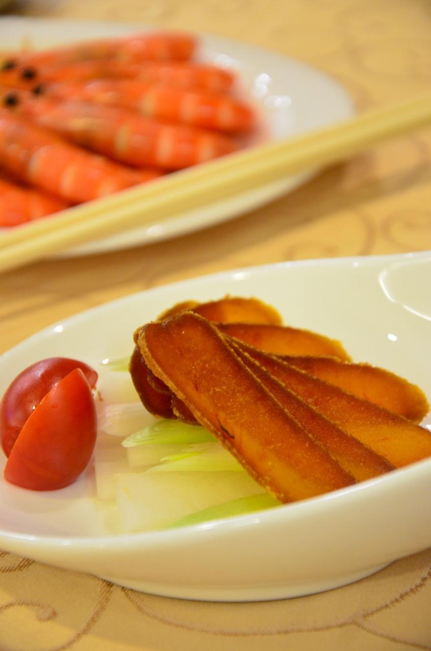 食事はカラスミやイカのフリッター、は
