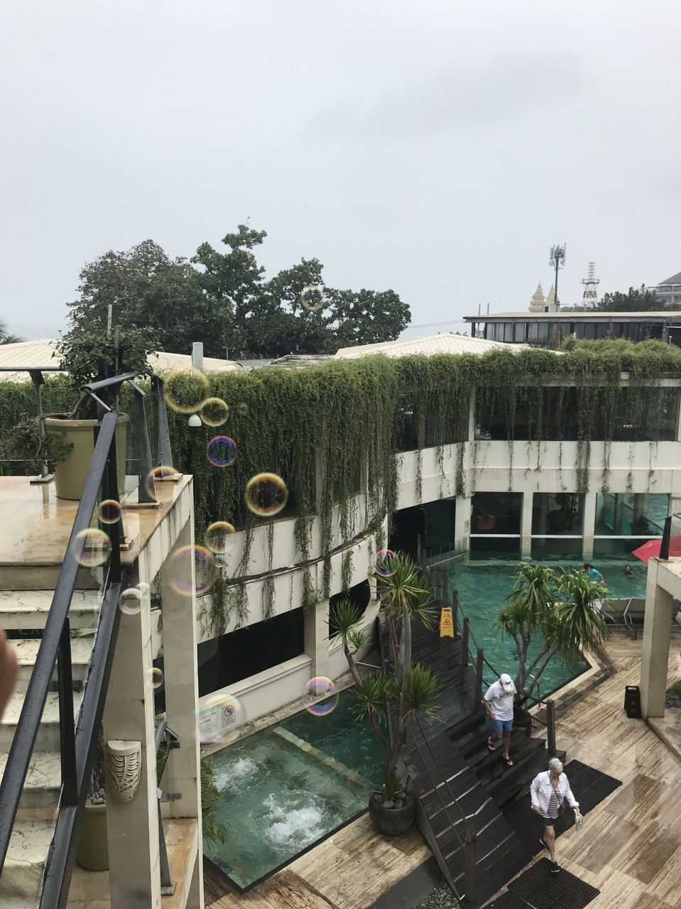 私達が泊まったのは三階のオーシャンビューのお部屋でした!ほとんどガラス張りのお部屋なので 心配でしたが ロールカーテンがあるのでその辺は大丈夫でした♪バルコニーは大きなアジアンテイストのテーブルと椅子が用意されており その横には ベットとテーブルがありすごく広々としています。植物がたくさんあり手入れされていたので すごく素敵です♡
